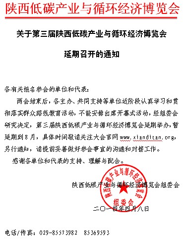 關(guān)于第三屆陜西低碳產(chǎn)業(yè)與循環(huán)經(jīng)濟(jì)博覽會(huì)延期召開的通知