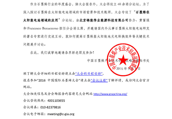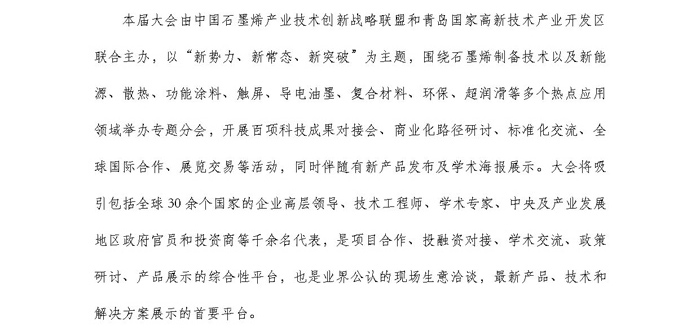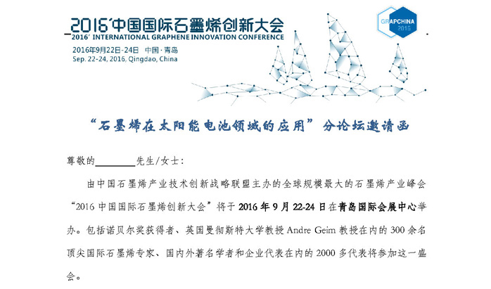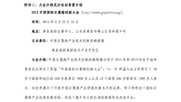 由中國石墨烯產(chǎn)業(yè)技術(shù)創(chuàng)新戰(zhàn)略聯(lián)盟主辦的全球規(guī)模最大的石墨烯產(chǎn)業(yè)峰會(huì)“2016中國國際石墨烯創(chuàng)新大會(huì)”將于2016年9月22-24日在青島國際會(huì)展中心舉辦。
