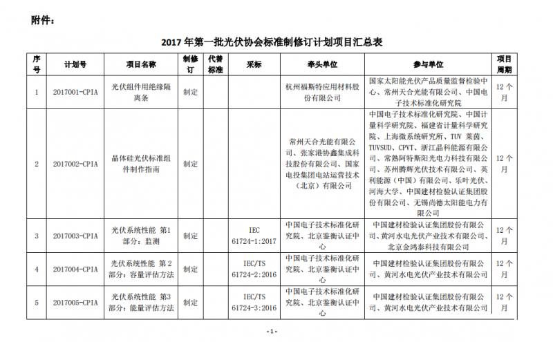 根據(jù)中國光伏行業(yè)協(xié)會標準制修訂工作的總體安排,經(jīng)研究,現(xiàn)將2017年第一批光伏協(xié)會標準制修訂計劃(共計7項,見附件)印發(fā)給你們,請認真組織落實。具體要求如下: 一、標準起草單位要注意做好標準制定與技術(shù)創(chuàng)新、試驗驗證、知識產(chǎn)權(quán)處置、產(chǎn)業(yè)化推進和應(yīng)用推廣的統(tǒng)籌協(xié)調(diào),在標準起草中加強與有