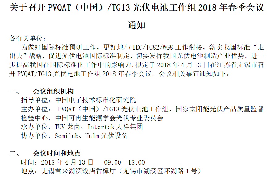 【標(biāo)準(zhǔn)會(huì)議】“PVQAT 電池標(biāo)準(zhǔn)委員會(huì)2018年春季會(huì)議”暨“晶體硅先進(jìn)光伏技術(shù)和材料論壇” 總通知