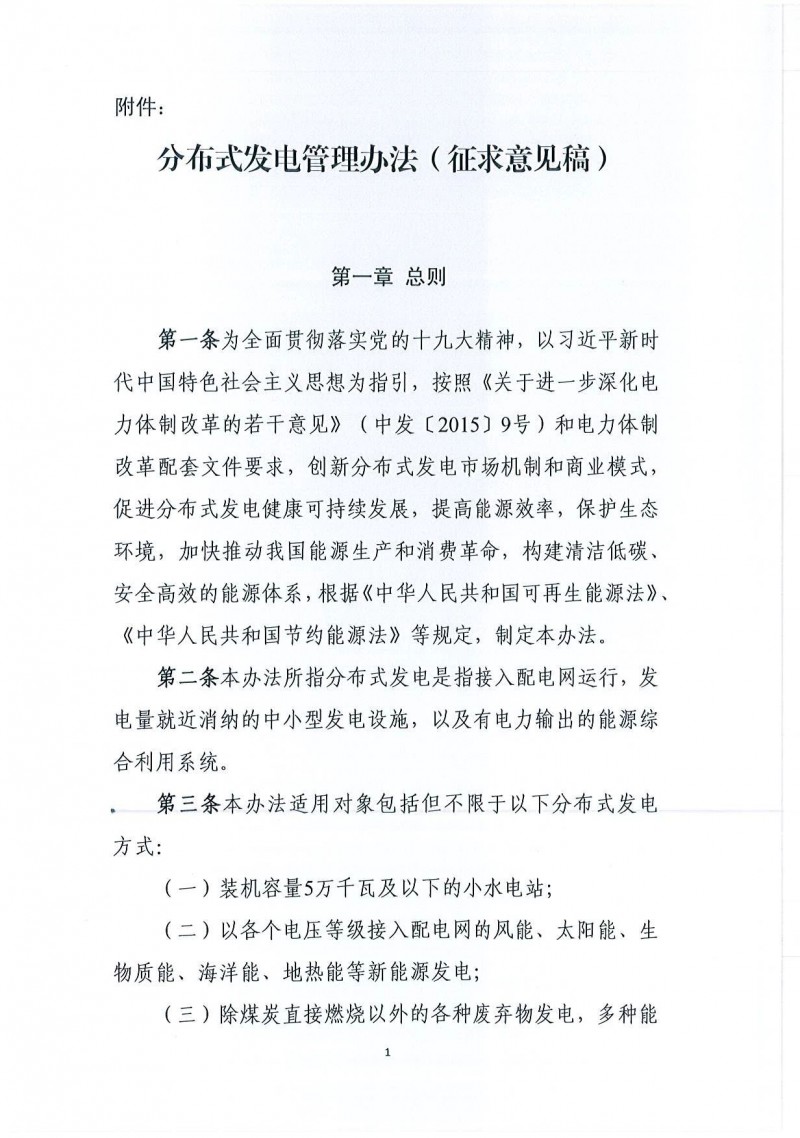 太陽能發(fā)電網(wǎng):3月20日,國家能源局綜合司印發(fā)了關(guān)于《分布式發(fā)電管理辦法(征求意見稿)》意見的函。本管理辦法所指分布式發(fā)電是指接入配電網(wǎng)運行,發(fā)電量就近消納的中小型發(fā)電設(shè)施,以及有電力輸出的能源綜合利用系統(tǒng)。適用對象包括但不限于以下分布式發(fā)電方式:(一)裝機容量5萬千瓦及以下的小水電站;(