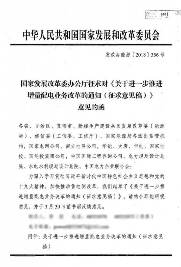 國家發(fā)展改革委辦公廳征求對《關于進一步推進增量配電業(yè)務改革的通知(征求意見稿)》意見的函(發(fā)改辦能源〔2018〕356號)