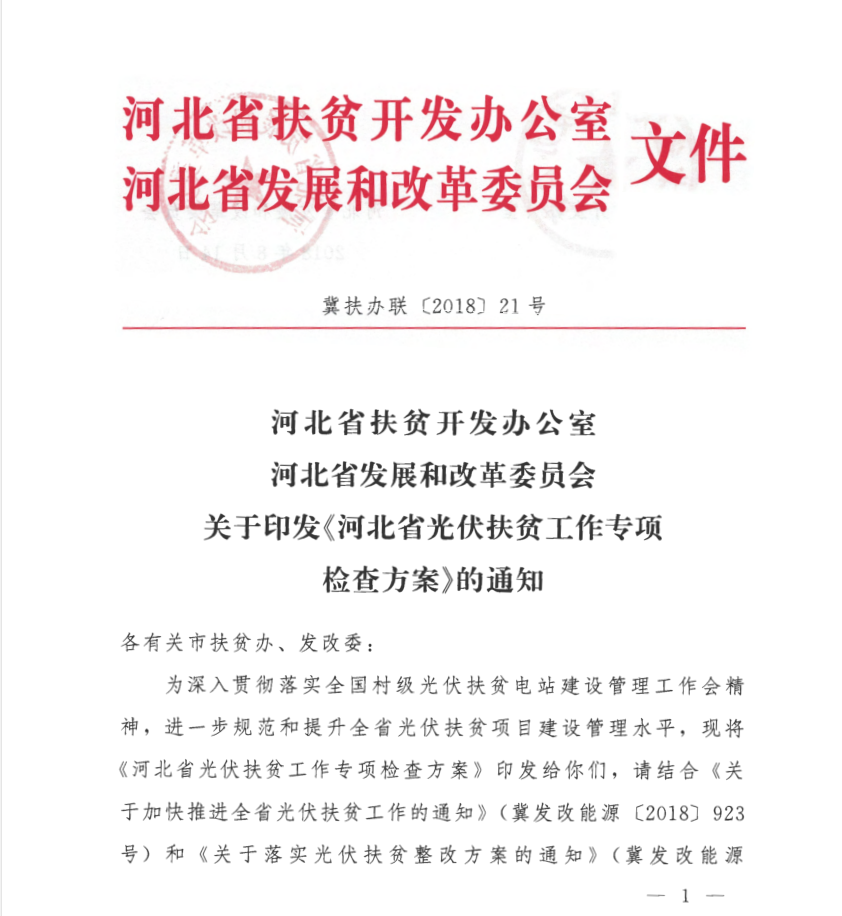 據(jù)悉,河北省扶貧辦、河北省發(fā)改委于近日聯(lián)合“《河北省光伏扶貧工作專項(xiàng)檢查方案》的通知”,要求于8月底前在全省有光伏扶貧任務(wù)的9個(gè)區(qū)市和41個(gè)縣全面開(kāi)展專項(xiàng)檢查,重點(diǎn)檢查村級(jí)光伏扶貧電站和集中式光伏扶貧電站,主要內(nèi)容包括組織推動(dòng)、工程質(zhì)量、運(yùn)行維護(hù)、收益分配等,要求各地組織自查,同時(shí)上級(jí)部門開(kāi)展核查和抽查,進(jìn)行三級(jí)聯(lián)動(dòng)式專項(xiàng)檢查。 ![]() ![]() |