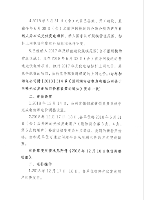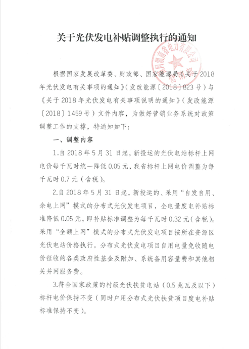12月17日,一份落款為國(guó)網(wǎng)湖南省電力有限公司營(yíng)銷部和財(cái)務(wù)資產(chǎn)部并加蓋上述兩部門公章的“關(guān)于光伏發(fā)電補(bǔ)貼調(diào)整執(zhí)行的通知”在微信群流傳,通知顯示,上述兩部門于2018年12月10日聯(lián)合下發(fā)該通知要求:5月31日以后新投運(yùn)的全額上網(wǎng)光伏電站補(bǔ)貼調(diào)降0.05元/千瓦時(shí),執(zhí)行0.70元/千瓦時(shí)上網(wǎng)電價(jià);5月31日以后投運(yùn)的自發(fā)自用余電上網(wǎng)的