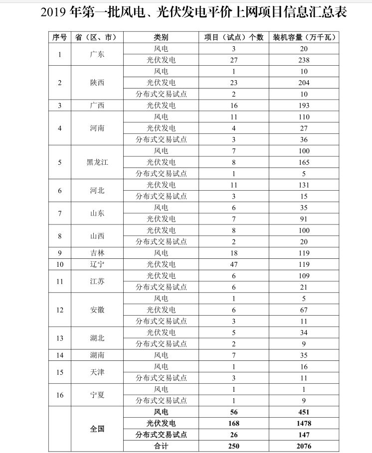 5月22日,國(guó)家發(fā)改委辦公廳、國(guó)家能源局綜合司發(fā)布通知,公布2019年第一批風(fēng)電、光伏發(fā)電平價(jià)上網(wǎng)項(xiàng)目。共有16個(gè)。ㄗ灾螀^(qū)、直轄市)能源主管部門(mén)向國(guó)家能源局報(bào)送了2019年第一批風(fēng)電、光伏發(fā)電平價(jià)上網(wǎng)項(xiàng)目名單,總裝機(jī)規(guī)模2076萬(wàn)千瓦。國(guó)家發(fā)展改革委辦公廳 國(guó)家能源局綜合司關(guān)于公布2019年第一批風(fēng)電、光伏
