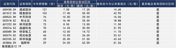 盡管A股絕大多數(shù)光伏企業(yè)今年年初以來的股價走低,但因原本屬于行業(yè)淡季的第三季度意外地產(chǎn)銷兩旺,超預期的行業(yè)熱度也傳遞至二級市場,促使不少光伏企業(yè)在這一時間段股價攀升,出現(xiàn)階段性亮點。 諸多企業(yè)這一階段的股價走勢甚至沖破了券商對其給予的目標價格。界面新聞記者統(tǒng)計發(fā)現(xiàn),今年券商累計發(fā)出900份涉A股光伏企業(yè)的研報,超八成光伏企業(yè)獲得券商的關注。這其中,有29家光伏企業(yè)獲得券商給定目標價格。以復權(quán)前價格測算,今年共有23家企業(yè)今年年初以來的最高價格觸及券商給予的目標價格區(qū)間。 ![]() 今年研報數(shù)居前十的A股光伏企業(yè)。數(shù)據(jù)來源:Wind資訊、界面新聞研究部 隆基股份(601012.SH)與通威股份(600438.SH)是A股僅有的兩家今年獲百份以上券商研報的光伏企業(yè),其關注度可見一斑。截至12月19日收盤,隆基股份與通威股份自今年年初以來的股價漲幅高居A股光伏企業(yè)前兩位,漲幅分別為158.95%、76.23%。 今年共計102份券商研報涉及隆基股份,券商綜合給予該公司的目標價格范圍為17.4元/股至50元/股。11月22日,隆基股份盤中股價摸高至42.95元/股,總市值高達857.28億元,創(chuàng)下歷史新高。 隆基股份最新的一份研報來自于中金公司,中金公司給隆基股份50元/股的目標價格,維持推薦評級。中金公司認為,首先,隨著技術升級推動光伏行業(yè)邁入“成本驅(qū)動”,高效的單晶技術滲透率有望不斷提升;其次,中金公司認為隆基股份將受益于其卓越的研發(fā)能力,其毛利率正在提升;最后,中金公司認為,隨著擴產(chǎn)計劃逐步完成,隆基股份在2019年有望成為全球最大的單晶硅片和組件制造商,從而打造全球最大太陽能科技巨頭。 事實上,給予隆基股份50元/股目標價的券商不止中金公司一家,招商證券、新時代證券給出了一致的目標價格。今年以來,招商證券四次調(diào)高隆基股份的目標價格,變動區(qū)間從2月份的18元/股上升至最新的50元/股,并維持“強烈推薦”評級。而新時代證券今年10月26日首次覆蓋隆基股份時就給予其“強烈推薦”評級,同時給出48元/股的目標價格。一周之后,該券商提高對隆基股份的目標價至50元/股。 截至12月19日,隆基股份報收34.87元/股,距離最高目標價還有43%的漲幅空間。 通威股份在今年獲得的券商研報數(shù)量甚至超過了隆基股份,多達117份,其券商目標價格變動區(qū)間為7.5元/股至17.25元/股。 11月21日,通威股份盤中股價一度達到14.68元/股,對應總市值為569.88億元,同樣創(chuàng)下歷史新高。 12月19日,海通證券發(fā)布了有關通威股份的最新研報,給予該公司六個月內(nèi)14.34元/股的目標價格,維持“買入”評級。12月15日,通威股份發(fā)布了一份2017年員工持股計劃和可轉(zhuǎn)換公司債券預案。海通證券認為,員工持股計劃有利于保障通威股份的長遠發(fā)展,而可轉(zhuǎn)債方案則有利于為通威股份5萬噸高純晶硅項目的投建提供資金支持。 通威股份今年收到券商的最高目標價格來自于國信證券,其給予通威股份17.25元/股的目標價格,并維持“買入”評級。 截至12月19日,通威股份報收11.15元/股,距離最高目標價還有55%的上升空間。 此外,晶盛機電(300316.SZ)、中天科技(600522.SH)、林洋能源(601222.SH)、科士達(002518.SZ)今年均獲得70份以上(含70份)券商研報,并且這些企業(yè)今年以來的最高價格達到券商目標價格變動區(qū)間。 然而,拓日新能(002218.SZ)、特變電工(600089.SH)、中利集團(002309.SZ)、億晶光電(600537.SH)、精功科技(002006.SZ)等企業(yè)今年最高價格仍低于券商預期。 以12月19日收盤價格為參考,億晶光電、精功科技距離券商今年給予的最高目標價格漲幅空間最大,分別為108.81%、120.28%。與券商預期的目標價格所產(chǎn)生的巨大差距則預示著,兩家公司今年在二級市場的日子并不好過。今年以來,億晶光電和精功科技困囿于經(jīng)營業(yè)績下滑,股價持續(xù)走低,其股價自今年年初以來的跌幅分別為32.31%、35.10%。 |