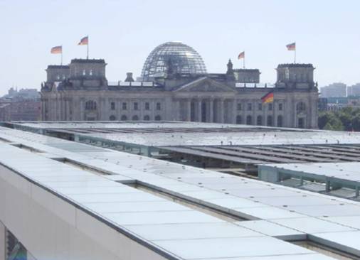 德國太陽能政府區(qū) 在德國柏林的聯(lián)邦政府所在地,有一片區(qū)域被叫做太陽能政府區(qū),在這片區(qū)域中,最著名的建筑就是柏林國會大廈。柏林國會大廈是一項改建工程,該大廈始建于1984年,原名帝國大廈。 兩德統(tǒng)一后,1992年,德國決定將國會大廈作為德意志聯(lián)邦議會的新地址,并為此舉行了國際設(shè)計競賽。世界著名建筑師福斯特及其設(shè)計事務(wù)所在全球800多名建筑師中脫穎而出,他勝出的重要原因之一是為國會大廈設(shè)定了一個改建目標,即要將國會大廈改建成一座低能耗、無污染、能吸納自然清風陽光的典型環(huán)保型建筑。 重建后的國會大廈于1999年完工,新的國會大廈采用了諸多節(jié)能和產(chǎn)能的新技術(shù)。 自然采光、自然通風、聯(lián)合發(fā)電及熱回收等等新技術(shù)系統(tǒng)的廣泛使用,不僅使新大廈的能耗和運轉(zhuǎn)費用降到了最低,而且還能作為地區(qū)的發(fā)電裝置向鄰近建筑物供電。被視為柏林新象征的玻璃穹頂,不僅有助于采光,也是自然通風系統(tǒng)的重要組成部分,還是電能和熱能的主要來源。綜合的生態(tài)技術(shù)的使用,使整個大廈設(shè)備的二氧化碳排放量減少了94%。 改建后,國會大廈采用生態(tài)燃料,以從油菜籽和葵花籽中提煉的油作為燃料,這種燃料燃燒發(fā)電高效、清潔。議會大廳遮陽和通風系統(tǒng)的動力來源于設(shè)置在屋頂結(jié)構(gòu)上的太陽能發(fā)電裝置,最高發(fā)電功率高達40千瓦。太陽能發(fā)電設(shè)備和穹頂內(nèi)可自動控制的遮陽系統(tǒng)相互結(jié)合,是建筑和太陽能發(fā)電結(jié)合的絕妙設(shè)計。這也是著名建筑師福斯特的作品中最神來之筆,沒有之一,使得改建后的國會大廈成為德國乃至全世界生態(tài)建筑的樣板之一。 在這片區(qū)域的其他政府機構(gòu)大樓,也都采用了太陽能和建筑的結(jié)合方式產(chǎn)生可再生能源,大多安裝至屋面。 ![]() 德國總理府