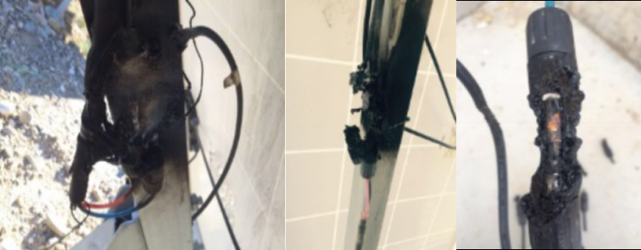 2、連接器 連接器是另一個容易導(dǎo)致失火的器件,比如MC4接頭。 “劣質(zhì)接頭很容易因接觸不良造成拉弧,輕者熔斷保險、線纜,重者燒毀組件和設(shè)備引起火災(zāi)。” 史陶比爾光伏總監(jiān)方宇明告訴記者,雖然連接器價格不高,但是用量較大。在通流情況下,如果連接器的電阻增大導(dǎo)致溫升增加,并超出塑料外殼及金屬件所能承受的溫度范圍,就容易引發(fā)火災(zāi)。 “可以說,連接器的失效并引發(fā)火災(zāi),是由塑料外殼和金屬件共同作用的結(jié)果!狈接蠲鞅硎,絕緣材料的選擇直接決定了連接器的質(zhì)量,特別是材料的耐候性、耐熱性、阻燃性、絕緣性等 ![]() 國內(nèi)光伏電站連接器燒毀案例 據(jù)介紹,目前業(yè)內(nèi)一些廠家使用回料生產(chǎn)連接器,可能也是導(dǎo)致連接器質(zhì)量下降的原因之一。 專家表示,雖然使用回料可以降低成本,但卻增加了產(chǎn)品在使用端的失效概率,連接器廠商對此應(yīng)該加以杜絕。 與連接器由連接的電纜的選擇也非常重要。一般來說,不同的連接器型號會對應(yīng)不同的電纜外徑,其目的是保證密封性能。如果密封不好,在戶外應(yīng)用時有可能會進(jìn)水進(jìn)塵,從而破壞絕緣性能,進(jìn)而引發(fā)火災(zāi)。 3、逆變器 據(jù)一位逆變器業(yè)內(nèi)人士介紹,歐美等很多國家都嚴(yán)格規(guī)定逆變器要具有電弧自動切斷保護(hù)功能,必須有兩級斷開機(jī)制:要么用兩個繼電器串聯(lián),要么一個繼電器里面必須有兩個斷開觸點(diǎn),這樣可做冗余保護(hù),防止一個壞了,另一個依然可起到隔離斷開作用。 而國內(nèi)由于缺少這方面的硬性規(guī)定,有的廠家為了減少成本,在國內(nèi)銷售的逆變器也就沒有這個功能。 據(jù)逆變器技術(shù)專家介紹,高質(zhì)量的逆變器,一般采用LCL三階濾波結(jié)構(gòu),但業(yè)內(nèi)一些逆變器廠商只有LC,省掉了其中的L,有的連繼電器的兩個斷開觸點(diǎn)也省掉一個,這樣做雖然能降低一些成本,但卻大大增加了后期運(yùn)行安全隱患。 國內(nèi)光伏電站逆變器燒毀案例 |
