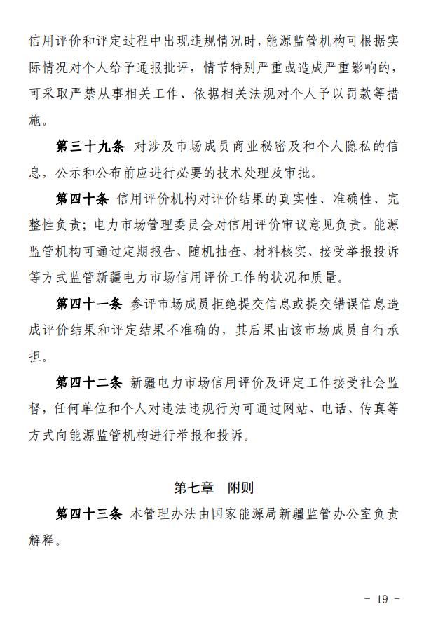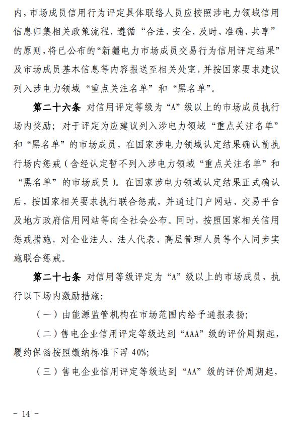 9月22日,國(guó)家能源局新疆監(jiān)管辦印發(fā)《新疆電力市場(chǎng)交易信用評(píng)價(jià)及評(píng)定管理辦法(試行)》的通知,依據(jù)《電力法》等法律法規(guī),結(jié)合新疆實(shí)際,制定本管理辦法。本管理辦法適用于新疆電力市場(chǎng)成員包括各類發(fā)電企業(yè)、售電公司(含擁有配電網(wǎng)運(yùn)營(yíng)權(quán)的售電公司、獨(dú)立的售電公司)、電網(wǎng)企業(yè)(含各局域電網(wǎng)企業(yè)、躉售縣(團(tuán)場(chǎng)