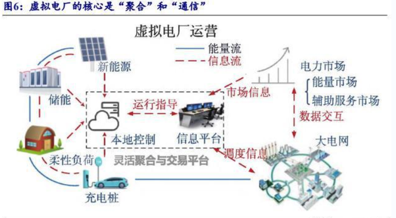 虛擬電廠提供的新能源電力與傳統(tǒng)能源和儲(chǔ)能裝置集成的模式,助力電力系統(tǒng)由傳統(tǒng)的“源隨荷動(dòng)”的運(yùn)行模式向“源荷互動(dòng)”轉(zhuǎn)變,從而保障在智能協(xié)同調(diào)控和決策支持下對(duì)大電網(wǎng)呈現(xiàn)出穩(wěn)定的電力輸出特性,成為新型電力系統(tǒng)安全穩(wěn)定運(yùn)行的有效抓手。 ![]() 電力供需趨緊背景下,虛擬電廠經(jīng)濟(jì)效益突出,前景可觀。根據(jù)36氪數(shù)據(jù),在需求側(cè),我國(guó)東西部電力供需關(guān)系趨緊,電力峰谷差矛盾日益突出,各地年最高負(fù)荷95%以上峰值負(fù)荷累計(jì)不足50小時(shí),亟需可靠的解決方案來應(yīng)對(duì)。在供給側(cè),技術(shù)日漸成熟促使虛擬電廠成本不斷下降。根據(jù)36氪引自國(guó)家電網(wǎng)數(shù)據(jù),通過火電廠實(shí)現(xiàn)電力系統(tǒng)削峰填谷,滿足5%的峰值負(fù)荷需要投資4000億;而通過虛擬電廠,在建設(shè)、運(yùn)營(yíng)、激勵(lì)等環(huán)節(jié)投資僅需500-600億元。我們認(rèn)為虛擬電廠顯示出較強(qiáng)的經(jīng)濟(jì)性,有望成為新型電力系統(tǒng)建設(shè)的重要方向。 ![]() 1.3、結(jié)構(gòu):虛擬電廠的核心在于“聚合”和“通信” 虛擬電廠的核心是“聚合”和“通信”,一是為配電網(wǎng)側(cè)屋頂光伏、小型燃?xì)廨啓C(jī)、用戶自建儲(chǔ)能、柔性負(fù)荷、充電汽車等分散式資源進(jìn)行聚合;二是為用戶和電網(wǎng)調(diào)度中心提供連接的平臺(tái),通過聚合技術(shù)服務(wù)于電網(wǎng)運(yùn)行,并從電網(wǎng)和用戶中獲取相應(yīng)的利潤(rùn)。 ![]() ![]() 1.4、發(fā)展階段:“合約型-市場(chǎng)型-自主型”演進(jìn) 按照資源類型,可將VPP分類為:需求型、供給型(電源型)和混合型三種。綜合參考《虛擬電廠技術(shù)和商業(yè)模式研究》、《虛擬電廠市場(chǎng)發(fā)展前景及實(shí)踐思考》(作者封紅麗),需求側(cè)資源型VPP以可控負(fù)荷以及用戶側(cè)儲(chǔ)能、DDG等資源為主,具有功率調(diào)節(jié)能力,可以參與輔助服務(wù)市場(chǎng),能量出售屬性不足。供給側(cè)資源型以PDG、電網(wǎng)側(cè)和發(fā)電側(cè)儲(chǔ)能等資源為主,具有能量出售的能力,可以參與能量市場(chǎng),并視實(shí)際情形參與輔助服務(wù)市場(chǎng);旌腺Y源型由分布式發(fā)電、儲(chǔ)能和可控負(fù)荷等資源共同組成。其中,日本和德國(guó)以儲(chǔ)能和分布式電源為主,美國(guó)以可控負(fù)荷為主。 |