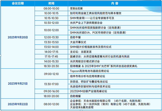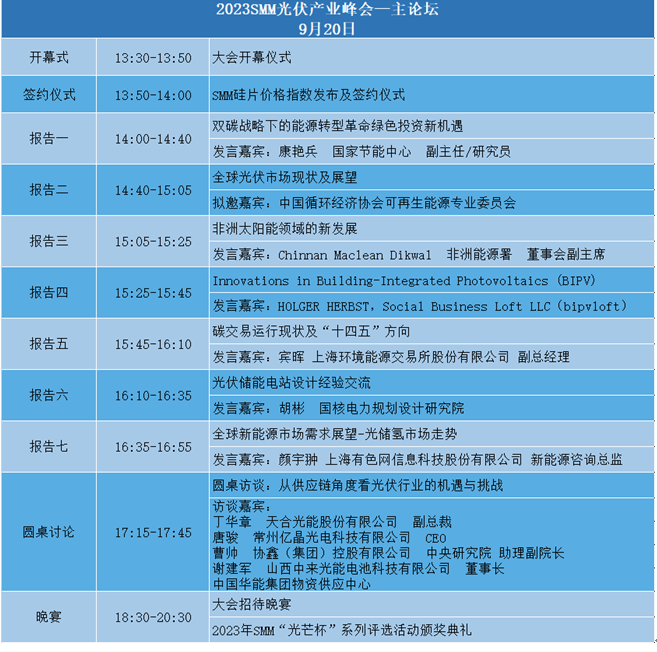華能、華電、大唐、國(guó)電投、華潤(rùn)電力、中廣核、中節(jié)能、一道、南!宕罅⊙嗑鄢V!![]() 會(huì)議動(dòng)態(tài) 2023年SMM光伏產(chǎn)業(yè)峰會(huì) 火熱報(bào)名中! 會(huì)議時(shí)間:2023年9月20-9月22 會(huì)議地點(diǎn):江蘇•常州 會(huì)議同期將舉辦: •大會(huì)主論壇 •七大分論壇 •新品發(fā)布 •創(chuàng)新項(xiàng)目路演活動(dòng) •‘光芒杯’頒獎(jiǎng)典禮 •光伏企業(yè)家雞尾酒會(huì) •企業(yè)參觀等 華能、華電、華潤(rùn)、大唐……等五大六小的踴躍報(bào)名讓產(chǎn)業(yè)鏈客戶更加完整,本次會(huì)議預(yù)計(jì)將有來(lái)自光伏上下游的1500名代表出席! 百位精英大咖演講交流分享經(jīng)驗(yàn),剖析行業(yè)發(fā)展痛點(diǎn)、難點(diǎn),更有圓桌會(huì)談,讓你與直面大咖,進(jìn)行頭腦風(fēng)暴、深度思維碰撞! 我們相信,本次會(huì)議將位與會(huì)各位帶來(lái)極具價(jià)值的參考,引發(fā)大家深度思考與交流,共同推進(jìn)光伏行業(yè)高質(zhì)量發(fā)展! ![]() 第一波參會(huì)名單揭曉 中國(guó)華能集團(tuán)物資有限公司 中國(guó)華電集團(tuán)物資有限公司 中國(guó)水利電力物資集團(tuán)有限公司 中國(guó)廣核集團(tuán)有限公司 協(xié)鑫科技控股有限公司 昆山協(xié)鑫光電材料有限公司 陽(yáng)光新能源開(kāi)發(fā)股份有限公司 陽(yáng)光電源股份有限公司 正泰安能數(shù)字能源(浙江)股份有限公司 常州天合智慧能源工程有限公司 深圳創(chuàng)維光伏科技有限公司 晶澳太陽(yáng)能科技股份有限公司 上饒捷泰新能源科技有限公司 極電光能有限公司 晶科能源股份有限公司 安徽華晟新能源科技有限公司 浙江潤(rùn)馬光能集團(tuán)有限公司 安徽大恒能源科技有限公司 杭州之江有機(jī)硅化工有限公司 無(wú)錫尚德太陽(yáng)能電力有限公司 江蘇中清光伏科技有限公司 唐山海泰新能科技股份有限公司 廣東聯(lián)塑班皓新能源科技集團(tuán)有限公司 東方日升新能源股份有限公司 正泰新科技有限公司 天合光能股份有限公司 山西中來(lái)光能電池科技有限公司 江蘇寶馨科技股份有限公司 上海海優(yōu)威新材料股份有限公司 中國(guó)南玻集團(tuán)股份有限公司 常州斯威克光伏新材料有限公司 萬(wàn)華化學(xué)集團(tuán)股份有限公司 蘇州普兆新能源設(shè)備有限公司 上海回天新材料有限公司 常州百佳年代薄膜科技股份有限公司 常州亞瑪頓股份有限公司 常州億晶光電科技股份有限公司 一道新能源科技股份有限公司 湖南立新硅材料科技有限公司 江蘇雙良低碳產(chǎn)業(yè)技術(shù)研究院有限公司 江蘇日托光伏科技股份有限公司 先導(dǎo)科技集團(tuán)有限公司 浙商中拓集團(tuán)股份有限公司 山東力諾光伏高科技有限公司 環(huán)晟光伏(江蘇)有限公司 江蘇賽拉弗光伏系統(tǒng)有限公司 酒泉綠能科技裝備有限公司 中山翰華錫業(yè)有限公司 凱鑫管道科技有限公司 蘇州尋跡智行機(jī)器人技術(shù)有限公司 南京萬(wàn)德斯純水科技有限公司 蘇州悉智科技有限公司 大連連城數(shù)控機(jī)器股份有限公司 珠海格力智能裝備有限公司 電投中能新能源(北京)有限公司 江蘇華英閥業(yè)有限公司 賽拉弗能源集團(tuán)股份有限公司 協(xié)合新能源集團(tuán)有限公司 隆基樂(lè)業(yè)光伏科技有限公司 賀利氏光伏(上海)有限公司 浙江愛(ài)旭太陽(yáng)能科技有限公司 賽富電力集團(tuán)股份有限公司 長(zhǎng)峽智慧能源(江蘇)有限公司 江蘇美科太陽(yáng)能科技股份有限公司 African Energy Council >>參會(huì)企業(yè),持續(xù)更新中... (以上排名不分先后) ![]() 會(huì)議議程 ![]() 詳細(xì)議程 ![]() ![]() ![]() ![]() ![]() ![]() 參會(huì)報(bào)名通道 ![]() 聯(lián)系人:17621728854 期待與您相約2023SMM光伏產(chǎn)業(yè)峰會(huì),9月20-22日,不見(jiàn)不散! 報(bào)名表下載