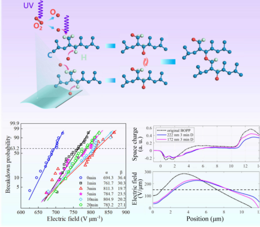 近日,中國(guó)科學(xué)院電工研究所研究員邵濤團(tuán)隊(duì)利用放電等離子體提升儲(chǔ)能電容器薄膜性能獲進(jìn)展;谠搱F(tuán)隊(duì)在氣體放電機(jī)理、參數(shù)調(diào)控及材料改性應(yīng)用等方面的積累,該研究通過(guò)氣體放電驅(qū)動(dòng)準(zhǔn)分子深紫外光源,在常壓空氣中輻照商業(yè)電容器薄膜,僅一步處理顯著提升薄膜擊穿電場(chǎng)、儲(chǔ)能密度等性能,對(duì)突破國(guó)產(chǎn)儲(chǔ)能電容器薄膜性能瓶頸具有重要意義。 薄膜電容器是特高壓直流輸電、柔性直流輸電、電磁能裝備的核心儲(chǔ)能器件。雙向拉伸聚丙烯(BOPP)作為薄膜電容器的關(guān)鍵材料,具有擊穿電場(chǎng)高、常溫?fù)p耗低等優(yōu)勢(shì)。而高溫下BOPP擊穿電場(chǎng)嚴(yán)重下降、損耗急劇提升,成為限制薄膜電容器性能的瓶頸,F(xiàn)有研究多通過(guò)無(wú)機(jī)摻雜、表面噴涂、沉積、接枝等方法,提升BOPP介電性能,但常用化學(xué)試劑多步處理,并可能引入新的界面問(wèn)題,尚需攻克從實(shí)驗(yàn)室到工業(yè)應(yīng)用的難題。 該研究采用氣體放電等離子體高效產(chǎn)生KrCl 222 nm和Xe2 172 nm準(zhǔn)分子深紫外光,具有光子能量高、環(huán)境友好等優(yōu)勢(shì),在常壓空氣中直接輻照改性BOPP。這一“軟”改性方法可無(wú)損實(shí)現(xiàn)BOPP斷鍵、重構(gòu),裂解氧分子、產(chǎn)生氧原子,形成熱穩(wěn)定性更好的C-O鍵,并避免引入新的界面問(wèn)題。改性后BOPP擊穿電場(chǎng)常溫下提升17%、120°C下提升52%,常溫下效率大于95%放電密度由4 MJ/m3提升到7.5 MJ/m3。該方法可以拓展到PET、PEN、PEI等高溫介質(zhì)薄膜,具有良好的通用性。 為了揭示改性?xún)?nèi)在機(jī)理,該工作建立了分辨率達(dá)0.5 μm的激光誘導(dǎo)壓力波空間電荷測(cè)量方法,原位獲得了改性前后BOPP原樣品的空間電荷分布,發(fā)現(xiàn)了深紫外光改性可以顯著減少空間電荷量、弱化電場(chǎng)畸變;結(jié)合密度泛函理論計(jì)算,闡明了氧原子引入BOPP鏈后形成深陷阱,限制載流子遷移。 該研究全鏈條深度融合放電等離子體產(chǎn)生與材料改性應(yīng)用。處理過(guò)程不涉及任何化學(xué)試劑、不產(chǎn)生高污染副產(chǎn)物,具有一步、通量大、能耗低等優(yōu)勢(shì)。該團(tuán)隊(duì)正在開(kāi)展將該技術(shù)植入薄膜電容器“卷對(duì)卷”生產(chǎn)線(xiàn)的成果轉(zhuǎn)化。 相關(guān)研究成果以Improving Charge Storage of Biaxially-Oriented Polypropylene Under Extreme Electric Fields by Excimer Uv Irradiation為題,在線(xiàn)發(fā)表在《先進(jìn)材料》(Advanced Materials)上。研究工作得到國(guó)家自然科學(xué)基金和智能電網(wǎng)聯(lián)合基金等的支持。 ![]() |