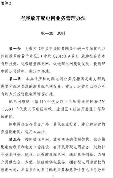 為貫徹落實《中共中央 國務院關(guān)于進一步深化電力體制改革的若干意見》(中發(fā)〔2015〕9號)和電力體制改革配套文件精神,有序向社會資本放開配售電業(yè)務,國家發(fā)展改革委、國家能源局制定了《售電公司準入與退出管理辦法》和《有序放開配電網(wǎng)業(yè)務管理辦法》,現(xiàn)印發(fā)給你們,請按照執(zhí)行。