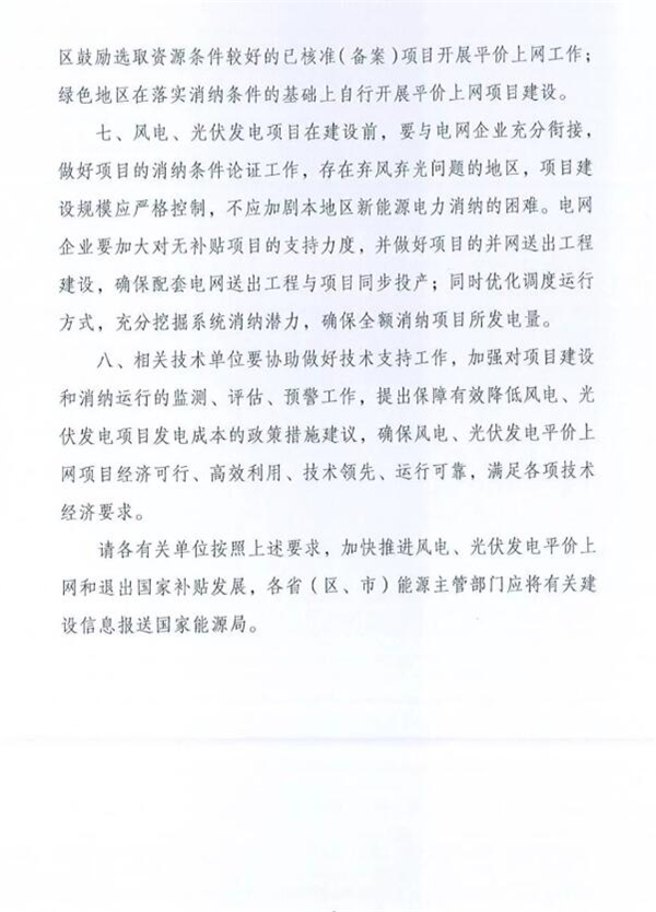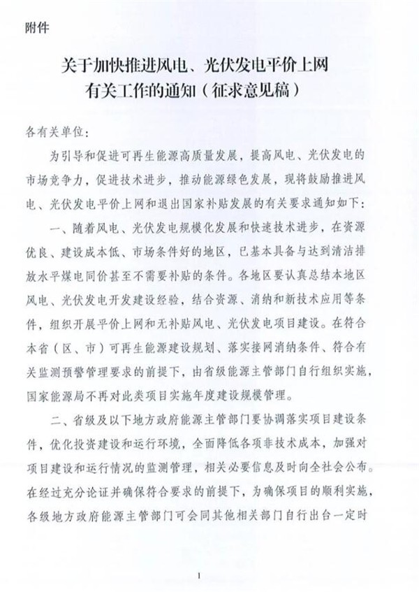 9月14日,從業(yè)內(nèi)獲悉,國(guó)家能源局下發(fā)《關(guān)于加快推進(jìn)風(fēng)電、光伏發(fā)電平價(jià)上網(wǎng)有關(guān)工作的通知(征求意見稿)》。通知指出,國(guó)家能源局對(duì)符合各。▍^(qū)、市)可再生能源建設(shè)規(guī)劃、落實(shí)接網(wǎng)消納條件、符合有關(guān)有關(guān)監(jiān)測(cè)預(yù)警管理要求的項(xiàng)目,不再實(shí)施年度建設(shè)規(guī)模管理。通知強(qiáng)調(diào):1.在資源優(yōu)良、建設(shè)成本
