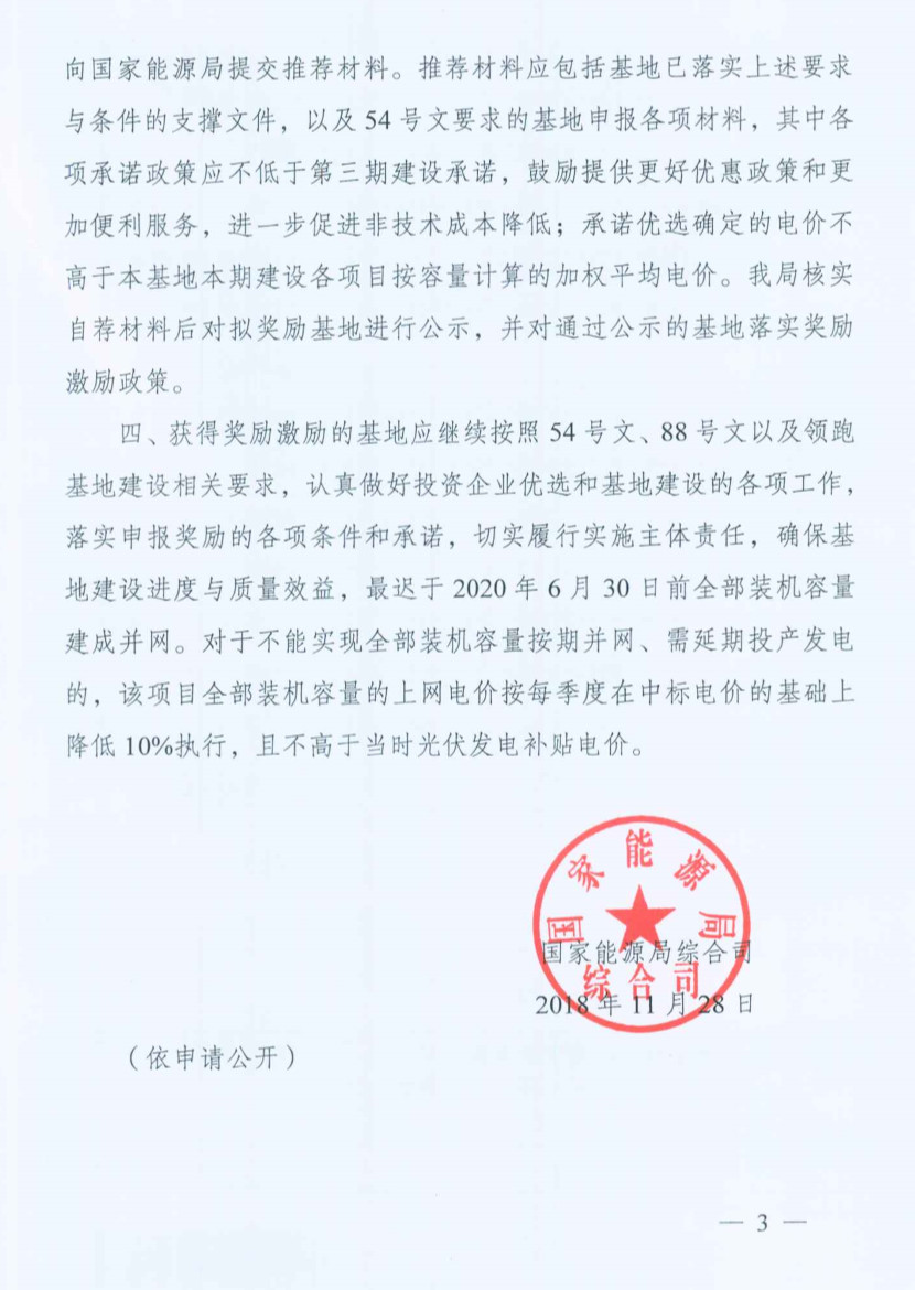 近日,國(guó)家能源局綜合司發(fā)布《關(guān)于光伏發(fā)電領(lǐng)跑基地獎(jiǎng)勵(lì)激勵(lì)有關(guān)事項(xiàng)的通知》,對(duì)2017年光伏發(fā)電基地給予3個(gè)共150萬(wàn)千瓦等量規(guī)模連續(xù)建設(shè)作為獎(jiǎng)勵(lì)激勵(lì)。 獲得獎(jiǎng)勵(lì)的基地可以按照要求繼續(xù)申報(bào)后續(xù)領(lǐng)跑基地,但不予加分優(yōu)先考慮。獎(jiǎng)勵(lì)規(guī)模由相關(guān)基地自愿申報(bào)。相關(guān)材料于2019年1月底前向國(guó)家能源局報(bào)送推薦材料。新增獎(jiǎng)勵(lì)基地最遲應(yīng)于2020年6月30日前并網(wǎng)發(fā)電。 原文如下: ![]() ![]() ![]() ![]() |