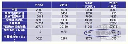 他在分析市場(chǎng)供需情況時(shí)表示,對(duì)中國企業(yè)可接觸的市場(chǎng)(見圖4),考慮到歐美“雙反”的影響,2013年的市場(chǎng)需求容量存在很大不確定性。供給方面,2013上半年可能是行業(yè)最差時(shí)期。10~20%的GW級(jí)大廠、30%的100~500MW級(jí)中型廠、60~80%的100MW級(jí)小廠會(huì)被迫退出。預(yù)計(jì)2013年底,全球產(chǎn)能55~60GW,中國大陸廠商的產(chǎn)能降至30~40GW,而國內(nèi)產(chǎn)能通常占全球產(chǎn)能的一半以內(nèi),產(chǎn)能過剩仍將持續(xù)。
