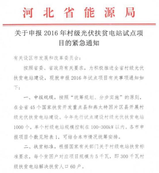 此前,《太陽能發(fā)電》雜志記者曾從其他渠道獲悉,河北省計劃在此試點基礎上,用三年的時間完成4000個村級光伏扶貧電站建設。為此,各貧困縣將專門成立光伏扶貧資金平臺,并協同電力部門配合,確保村級扶貧電站的上網結算等。(吳軍杰)