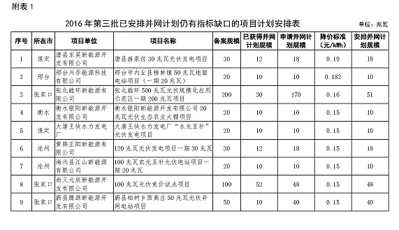 按照國家能源局《關(guān)于調(diào)整2016年光伏發(fā)電建設(shè)規(guī)模有關(guān)問題的通知》(國能新能〔2016〕383號)要求,經(jīng)各市發(fā)改委申報(bào)、企業(yè)競價(jià)承諾、電網(wǎng)公司確認(rèn),現(xiàn)將2016年第三批普通光伏發(fā)電項(xiàng)目并網(wǎng)計(jì)劃予以下達(dá),并就有關(guān)事項(xiàng)通知如下......
