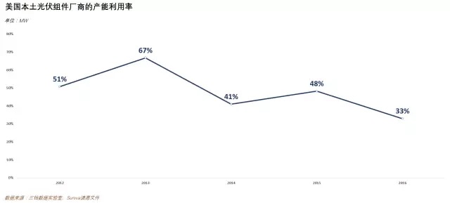 3. 美國光伏行業(yè)有多慘 2016年,美國的新增裝機量接近15GW,就增量來說,全球排名第二。 ![]() 同期,美國本土組件工廠的產(chǎn)量只有0.5GW。 ![]() 也就是說,超過95%的需求是由國外工廠的產(chǎn)量來滿足,本土廠商的產(chǎn)能利用率只有30%出頭。 ![]() 2012 - 2016年之間,美國至少有8家晶硅電池/光伏廠商倒閉,所以在Suniva向USITC提交的請愿陳述中,公司悲切地說道: