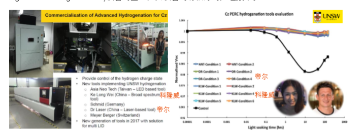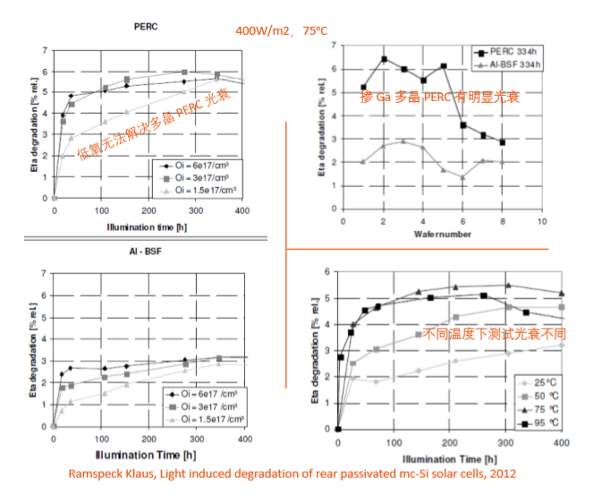 ![]() UNSW(新南威爾士大學(xué))認(rèn)為(光致)再生過程的機(jī)理在于促使P型硅中存在的H+轉(zhuǎn)化為H0,H0可以鈍化BO+缺陷乃至金屬離子如Fei+、Cri+,商業(yè)化的光致再生設(shè)備因需要高生產(chǎn)速率,因此需要利用到高強(qiáng)度的光照(如激光)以在幾秒鐘內(nèi)完成再生過程。如下報(bào)告列舉了5家提供光致再生(LIR,Lightinduecdregeneration)設(shè)備的企業(yè),其設(shè)備均有很好的處理效果。 ![]() 國內(nèi)的晶寶、時創(chuàng)、昊建等均開發(fā)了電注入(電致再生)設(shè)備,不同于光注入設(shè)備需要在電池端與在線生產(chǎn),電注入設(shè)備可以離線布置在電池端或組件端,多個電池片堆疊通電處理,在制造端也得到了大規(guī)模的應(yīng)用。 另外,摻Ga的P型硅與摻磷的N型硅則可以根本上杜絕了“B-O”衰減,也可以解決單晶PERC技術(shù)的光衰風(fēng)險(xiǎn)。因此單晶PERC技術(shù)規(guī)模應(yīng)用在理論上不存在問題,卻對硅片品質(zhì)與電池技術(shù)提出了更高的要求,光伏電站投資者需要選擇技術(shù)可靠的供應(yīng)商以避免風(fēng)險(xiǎn)。 3.多晶PERC光衰與LeTID 根據(jù)以下2012年的研究,低氧與摻Ga均無法解決多晶PERC電池的光衰問題,并展示了不同溫度下測試光衰的差別,75oC下的光衰明顯高于25oC的結(jié)果,而75oC是組件戶外工作時可能出現(xiàn)的溫度。 ![]() 因此Q-Cells在15年命名的LeTID(Light andelevated Temperature Induced Degradation,光與升溫導(dǎo)致的衰減)并不是一個新的概念,不少文獻(xiàn)還是堅(jiān)持使用LIDinmc-silicon(多晶光衰)來描述同一現(xiàn)象。Q-Cells發(fā)現(xiàn)多晶PERC電池的開路電壓衰減在95oC高載流子注入的情況下在800小時后恢復(fù)至約99%,表明了多晶PERC電池再生態(tài)處理理論上的可行性,但由于耗時非常久,產(chǎn)業(yè)化付出的成本就會很高。 |