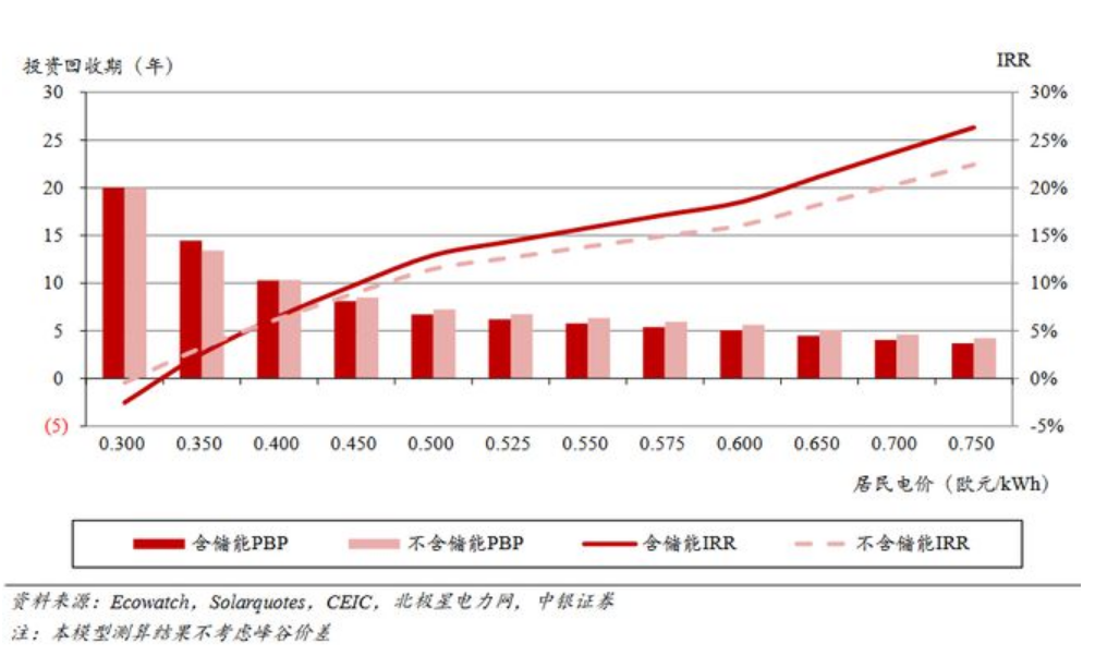 天然氣價(jià)格的有效控制是當(dāng)?shù)卣e極增加儲量、限制用量的結(jié)果,從當(dāng)前價(jià)格走勢來看,歐洲天然氣危機(jī)似乎已經(jīng)逐步得到解決。但結(jié)合2022年歐洲27國天然氣消耗量數(shù)據(jù)觀察,2022年1-11月,歐洲27國各月天然氣消耗量同比下滑幅度從-5%到-27%不等,除去暖冬天氣影響,供給緊張、價(jià)格高企以及政府對用電量的控制也在一定程度上抑制了當(dāng)?shù)靥烊粴庑枨,部分與天然氣相關(guān)的生產(chǎn)生活活動并非處在正常開展?fàn)顟B(tài),因此這一價(jià)格的回落或許并不能夠反映歐洲天然氣的真實(shí)供需關(guān)系。 盡管氣價(jià)回落和暴利稅限制有利于降低批發(fā)電價(jià),但居民電價(jià)仍由供需關(guān)系決定。歐洲市場不同于國內(nèi)市場,居民電價(jià)走勢依然由供需關(guān)系決定。如若電價(jià)上限政策削弱了企業(yè)發(fā)電經(jīng)濟(jì)性與積極性,或天然氣供應(yīng)量無法滿足正常發(fā)電消耗,電力市場將呈現(xiàn)出供不應(yīng)求狀態(tài)。 在此背景下,即便成本端得到有效控制,歐洲居民用電的價(jià)格或仍將在市場化交易的規(guī)則下出現(xiàn)進(jìn)一步上浮,居民電價(jià)與批發(fā)電價(jià)價(jià)差或從當(dāng)前0.2-0.3歐元/kWh的基準(zhǔn)上拉大,終端電價(jià)或仍處在0.4歐元/kWh以上的較高水平。 氣價(jià)回落、暴利稅限制,并未抑制歐洲戶儲經(jīng)濟(jì)性 在晚間用電量占比60%,貸款比率50%,貸款利率3.60%,光伏系統(tǒng)成本2.50歐元/W,儲能系統(tǒng)成本1.00歐元/W,不考慮峰谷價(jià)差的前提假設(shè)下,對歐洲戶用光儲系統(tǒng)經(jīng)濟(jì)性進(jìn)行了彈性測算,發(fā)現(xiàn)在0.40歐元/kWh及以上的居民用電價(jià)格水平下,光儲系統(tǒng)經(jīng)濟(jì)性已開始超越純光伏系統(tǒng),IRR達(dá)到6.5%,投資回報(bào)周期約10.28年,若進(jìn)一步考慮峰谷價(jià)差,戶用光儲系統(tǒng)經(jīng)濟(jì)性則還有望進(jìn)一步提升。 在此基礎(chǔ)上,上述暴利稅政策與天然氣價(jià)格回落等因素并不影響歐洲家庭安裝戶用光儲系統(tǒng)的經(jīng)濟(jì)性。測算表明,光儲系統(tǒng)在0.4歐元/kWh的終端電價(jià)水平上仍具備經(jīng)濟(jì)性,當(dāng)?shù)匦枨蟾咴鲩L趨勢仍有望延續(xù)。 ![]() 圖:歐洲戶用光儲系統(tǒng)投資回收期與IRR彈性測算 有機(jī)構(gòu)預(yù)測,2023年歐洲戶用儲能裝機(jī)量有望實(shí)現(xiàn)13GWh,同比增速接近翻倍。 在經(jīng)歷過歐洲能源危機(jī)后,居民已經(jīng)形成對戶用光儲系統(tǒng)的認(rèn)知和消費(fèi)習(xí)慣,戶用儲能滲透率有望繼續(xù)提升。此外,在政策層面,德國減免戶用儲能增值稅、意大利儲能稅收抵免額度退坡等利好亦將持續(xù)支持需求快速提升,根據(jù)機(jī)構(gòu)測算,2022-2023年戶用儲能裝機(jī)量有望分別達(dá)到6.72GWh、13.33GWh,同比增長289.02%、98.33%。 |