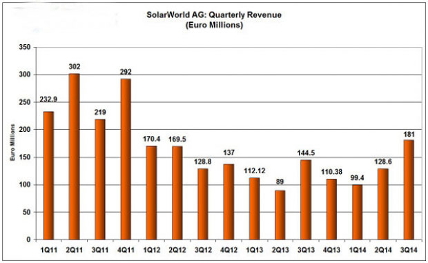 SolarWorld日前報(bào)告,主要由于反傾銷裁決后在美國銷量的提高,2014年第三季度初步財(cái)務(wù)業(yè)績標(biāo)志著光伏組件出貨量和收入的大幅提高。 該公司報(bào)告,2014年第三季度收入為1.81億歐元,較上季度第二次美國反傾銷裁決之前1.286億美元有所提高。&
