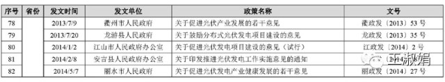 “國八條”之后,各地均出臺(tái)了本地區(qū)落實(shí)“國八條”的具體政策。 本文統(tǒng)計(jì)了截止11月份,82個(gè)各省及地方共出臺(tái)的光伏促進(jìn)、補(bǔ)貼、管理政策。剔除了之前頒布,但現(xiàn)在基本沒用的政策;剔除了只有名字或簡(jiǎn)介,但在網(wǎng)上找不到內(nèi)容的政策。大家可以根據(jù)這個(gè)名單