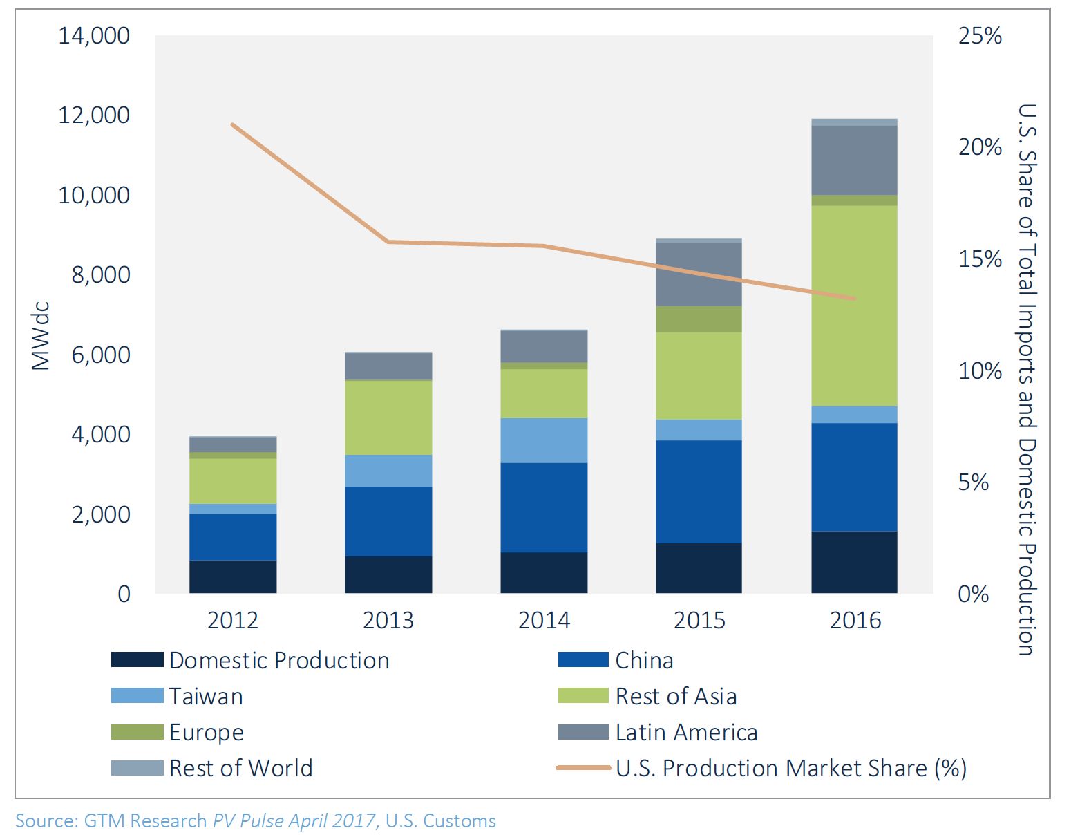就在本周一美國剛剛宣布向太陽能產(chǎn)品征保護性關稅,最高稅率達30%,雖然這是一項不針對國別的稅率,但其被普遍認為是一項針對中國的措施。 但實際上早在2012年美國就已經(jīng)出臺了針對中國太陽能產(chǎn)品出口的特別關稅,稅率也是30%。但幾年過去以后并沒有什么特別的效果:雖然中國對美國太陽能產(chǎn)品的直接出口當時在一年內就暴跌了45%,但此后中國通過對外投資的方式將產(chǎn)能轉移,在很大程度上繞過了關稅,同時境內生產(chǎn)也并未萎縮還照常擴張。 結果就是美國上一次的關稅使自己成了最大輸家:太陽產(chǎn)品的市場占比和就業(yè)雙雙持續(xù)下滑,到目前美國太陽能產(chǎn)品進口依賴率擴大至95%,2016年太陽能產(chǎn)業(yè)就業(yè)人口較上年繼續(xù)大減26萬人,降幅約26%。 ![]() 圖:2012年后的太陽能產(chǎn)品市場(注意主要增量來自綠色部分,目前美國進口量的一半來自于馬來西亞和韓國) 所以,這一次美國出臺的關稅,還是很難直接對中國造成打擊。美國如果要贏得太陽能產(chǎn)品的貿易戰(zhàn),擠壓中國太陽能產(chǎn)品市場份額,實現(xiàn)提升國內生產(chǎn)和就業(yè)的目的,必須依賴一個重要的“伙伴”——印度。 就在美國宣布加征關稅當天,印度保障措施總局緊跟著提議對進口太陽能產(chǎn)品征70%的關稅,立即生效。 |