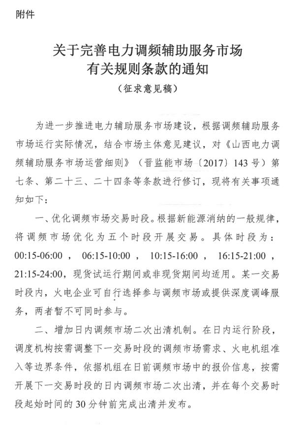 山西《關(guān)于完善電力調(diào)頻輔助服務(wù)市場有關(guān)規(guī)則》征求意見