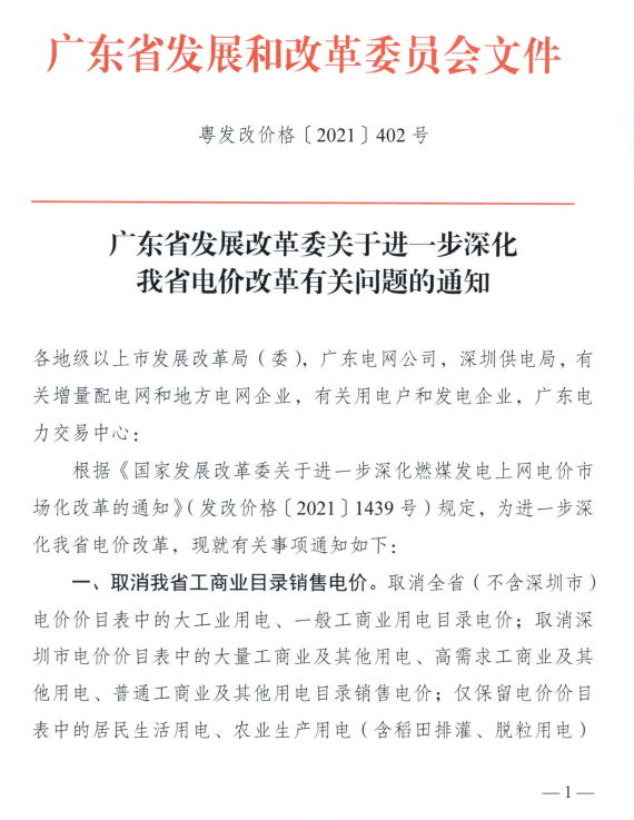 日前,廣東省發(fā)展改革委印發(fā)《關(guān)于進(jìn)一步深化我省電價改革有關(guān)問題的通知》,通知明確,取消工商業(yè)目錄銷售電價;保持居民、農(nóng)業(yè)用電價格穩(wěn)定; 完善電力市場交易;推動工商業(yè)用戶都進(jìn)入市場;建立健全電網(wǎng)企業(yè)代理購電機制;加強與分時電價政策銜接。通知如下: