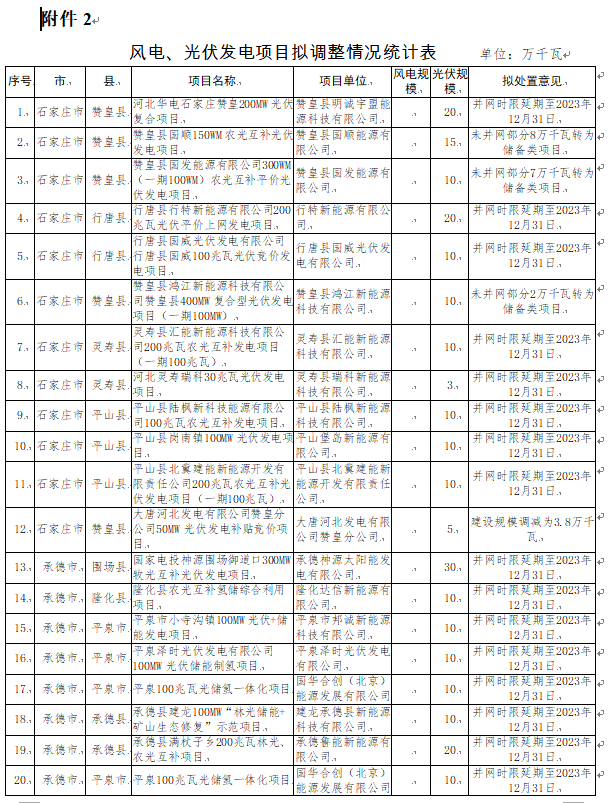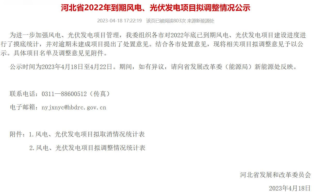 4月18日,河北省發(fā)改委對(duì)2022年到期風(fēng)電、光伏發(fā)電項(xiàng)目擬調(diào)整情況進(jìn)行公示。公示表示,為進(jìn)一步加強(qiáng)風(fēng)電、光伏發(fā)電項(xiàng)目管理,對(duì)2022年底已到期風(fēng)電、光伏發(fā)電項(xiàng)目建設(shè)進(jìn)度進(jìn)行了摸底統(tǒng)計(jì),并對(duì)逾期未建成項(xiàng)目提出了處置意見。其中,擬取消8個(gè)風(fēng)電、光伏發(fā)電項(xiàng)目,規(guī)模合計(jì)388MW;風(fēng)電、光伏發(fā)電項(xiàng)目擬調(diào)整37個(gè),