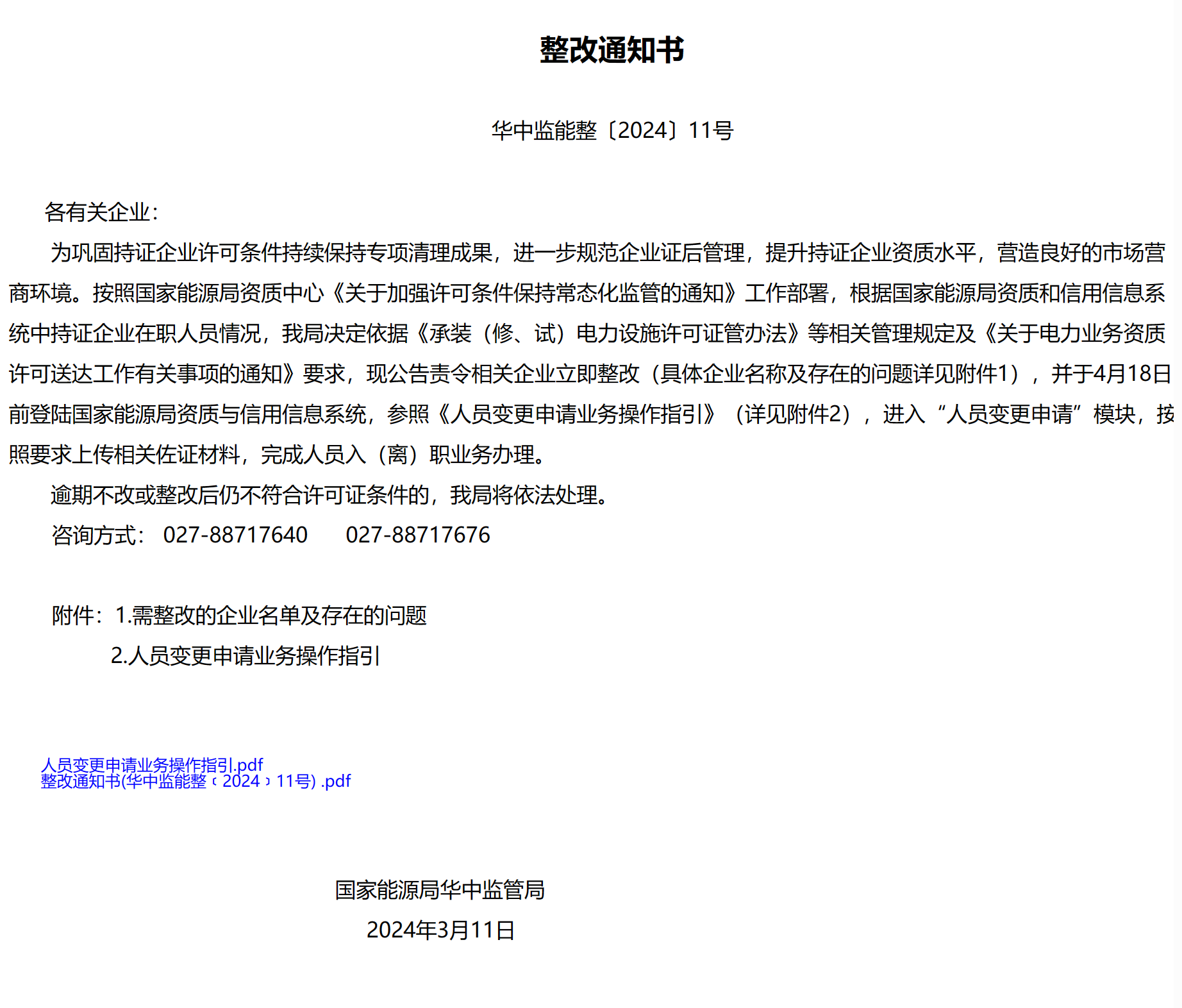 3月13日,國家能源局華中監(jiān)管局發(fā)布整改通知書,責令627個企業(yè)立即整改。逾期不改或整改后仍不符合許可證條件的將依法處理。 其中,涉及光伏企業(yè)7個,存在的問題多為缺少電力相關(guān)技術(shù)人員人數(shù)。 具體有:遠安新源光伏科技有限公司、贛州淼之陽光伏電力有限公司、吉安中和光伏科技有限公司、吉安中杰光伏發(fā)電有限公司、江西宏源光伏科技有限公司、江西金緣鑫光伏電力有限公司、江西英利光伏發(fā)電有限公司、興國力創(chuàng)光伏工程有限公司、宜春明恩光伏電力有限公司。