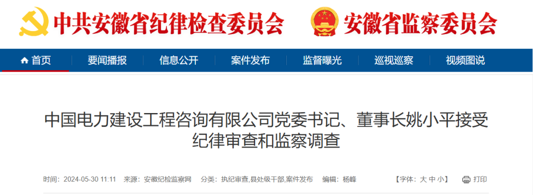中國電力建設工程咨詢有限公司黨委書記、董事長姚小平涉嫌嚴重違紀違法,目前正接受中國能源建設集團有限公司紀委紀律審查和安徽省蚌埠市監(jiān)委監(jiān)察調查。