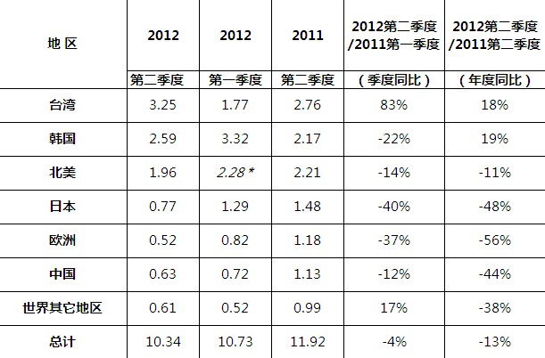各地區(qū)年度和季度出貨額同比增長(zhǎng)率(單位:百萬美元) 來源: 2012年9月,SEMI/SEAJ 注:進(jìn)行四舍五入后,數(shù)據(jù)可能會(huì)略有出入 * 對(duì)北美地區(qū)進(jìn)行了修訂