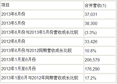 2013年7月9日訊-- 友達(dá)光電2013年6月份合并營(yíng)業(yè)額為新臺(tái)幣三百七十億三千一百萬元,營(yíng)業(yè)額較5月份下滑3.3%,較去年同期上升10.8%。累計(jì)2013年第二季合并營(yíng)業(yè)額為新臺(tái)幣一千一百二十三億三千五百萬元,較2013年第一季提升19.2%,與2012年第二季相比,則成長(zhǎng)18.0%。 注(*) 大尺寸面板系指10寸或10寸以上之面板,中小尺寸則定義為10寸以下面板。 友達(dá)光電營(yíng)運(yùn)報(bào)告: (單位:新臺(tái)幣百萬元)