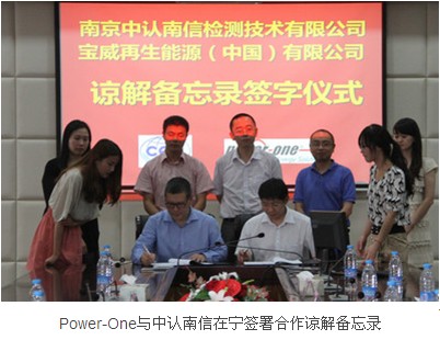 7月9日中國(guó)質(zhì)量認(rèn)證中心(CQC)所屬、中國(guó)新能源領(lǐng)域內(nèi)專業(yè)第三方技術(shù)服務(wù)機(jī)構(gòu)--中認(rèn)南信檢測(cè)技術(shù)有限公司(CQCTT) 與全球最大的光伏逆變器生產(chǎn)商之一 -- 美國(guó)寶威再生能源(中國(guó))有限公司(Power-One) 在南京簽署合作諒解備忘錄,確立了雙方的戰(zhàn)略伙伴關(guān)系,并在此基礎(chǔ)上發(fā)展更加緊密的平等
