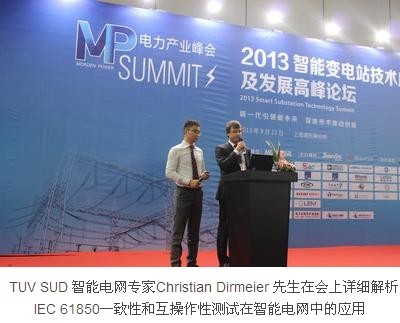 近期,由MG《現(xiàn)代電網(wǎng)》和MP國(guó)際電力產(chǎn)業(yè)網(wǎng)共同主辦的2013 智能變電站技術(shù)應(yīng)用及發(fā)展高峰論壇于近期在上海浦東展覽館成功舉行。此次峰會(huì)匯聚了智能變電站領(lǐng)域?qū)<覍W(xué)者、優(yōu)秀企業(yè)代表300余人,3000多人次專業(yè)買家及觀眾。TUV南德意志大中華集團(tuán)(以下簡(jiǎn)稱TUV SUD)受邀參加了此次論壇。TUV SUD 智能電網(wǎng)專家Christian Dirmeier 先生在會(huì)上詳細(xì)解析了IEC 61850一致性和互操作性測(cè)試在智能電網(wǎng)中的應(yīng)用。