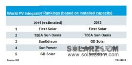IHS Technology 2014年與2013年光伏系統(tǒng)集成商前五強(qiáng)排名預(yù)測(cè)