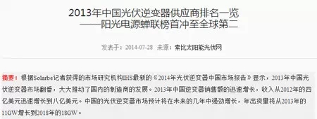 6、2014年07月,根據(jù)IHS報(bào)告,陽光光伏逆變器2013年發(fā)貨量全球第二,并成為全球最受歡迎的中國逆變器品牌