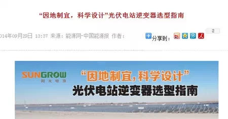 8、2014年09月,陽光電源發(fā)布“因地制宜,科學(xué)設(shè)計(jì)”逆變器選型綱領(lǐng),對(duì)光伏電站接入方案進(jìn)行了系統(tǒng)總結(jié)和科學(xué)指導(dǎo)