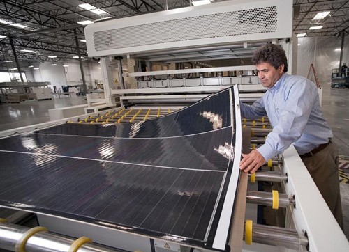 生產(chǎn)線上:SoloPower首席技術(shù)官穆斯塔法•比納巴斯(Mustafa Pinarbasi)正在展示他們的柔性光伏技術(shù)