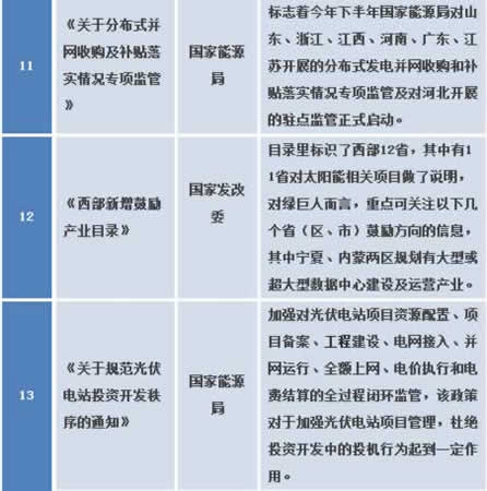 自2013年7月國務(wù)院出臺支持光伏產(chǎn)業(yè)發(fā)展的政策以來,國家能源局、各級地方政府相繼積極制定配套政策措施,現(xiàn)將2013-2014年國家能源局、地方發(fā)改委相繼發(fā)布的促進光伏產(chǎn)業(yè)的有序發(fā)展要點政策梳理如下,供業(yè)內(nèi)關(guān)注政策的同仁參考。 一、2014年國家相繼