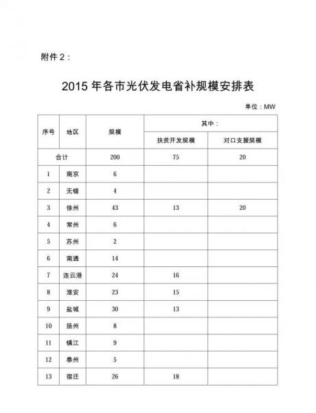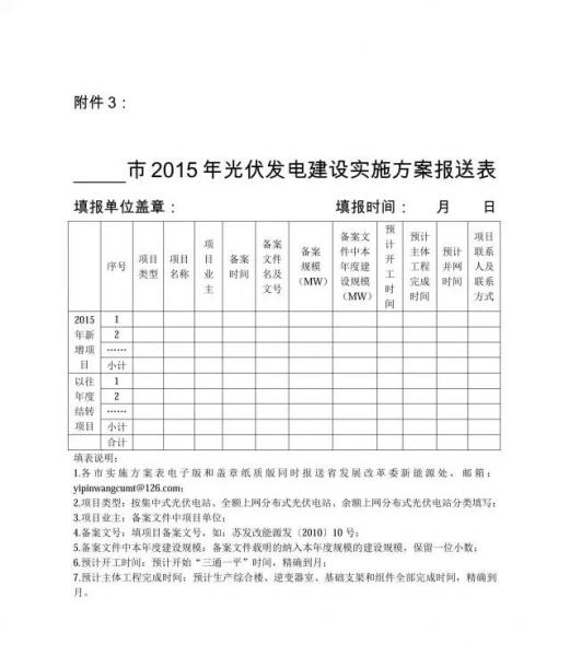 一、嚴(yán)格把握規(guī)模管理政策。根據(jù)國家能源局國能新能〔2015〕73號《通知》,本年度光伏發(fā)電新增建設(shè)規(guī)模是指各市2015年計劃新開工的集中式光伏電站和地面“全額上網(wǎng)”、“余額上網(wǎng)”分布式光伏電站項目的總規(guī)模,不包括“自發(fā)自用、余電上網(wǎng)”或“全額上網(wǎng)”屋頂分布式光伏發(fā)電項目,也不包括全部自發(fā)自用的地面分布式光伏發(fā)電項目。按照集中式與分布式并舉的原則,各地要根據(jù)本地實際,繼續(xù)推進(jìn)光伏電站與分布式光伏發(fā)電協(xié)同發(fā)展。 二、嚴(yán)謹(jǐn)履行項目備案手續(xù)。按照現(xiàn)行規(guī)定,所有光伏發(fā)電項目均實行備案制管理方式。對于實行規(guī)模管理的項目,請各市根據(jù)下達(dá)的光伏電站新增建設(shè)規(guī)模,依據(jù)《江蘇省企業(yè)投資項目備案暫行辦法》等規(guī)定,進(jìn)行優(yōu)選并備案。備案規(guī)模不得超過下達(dá)的年度規(guī)模。備案文件中應(yīng)載明“集中式光伏電站”、“全額上網(wǎng)分布式光伏電站”或“余額上網(wǎng)分布式光伏電站”類別。對于一次規(guī)劃、分期建設(shè)的集中式光伏電站,可以一次備案、分期(不超過三期)實施,也可以分期備案、分期實施,但2015年擬開工建設(shè)的一期項目,必須明確本期建設(shè)規(guī)模,并且在以后年度安排時予以優(yōu)先考慮。對于分布式光伏電站,應(yīng)滿足單個項目總規(guī)模不超過2萬千瓦、接入電壓等級不超過35千伏、所發(fā)電量主要在并網(wǎng)點變電臺區(qū)消納等3個條件,建設(shè)場地僅限于廢棄土地、荒山荒坡、廢棄物處置場所,以及不影響生態(tài)功能的灘涂、不改變農(nóng)用地用途并且不影響生產(chǎn)功能的農(nóng)業(yè)大棚和魚塘。對于分布式光伏電站項目,各市要會同當(dāng)?shù)毓╇姴块T等單位及時開展現(xiàn)場調(diào)查確認(rèn)工作。經(jīng)調(diào)查,符合分布式光伏電站建設(shè)條件的,方可受理并備案。對于屋頂分布式光伏發(fā)電項目和全部自發(fā)自用的地面分布式光伏發(fā)電項目,各地要嚴(yán)格執(zhí)行《省發(fā)展改革委關(guān)于推進(jìn)分布式光伏發(fā)電健康發(fā)展的意見》有關(guān)要求,隨時受理項目申請,及時予以備案,項目建成后即納入國家補貼資金支持范圍。 三、嚴(yán)謹(jǐn)科學(xué)配置建設(shè)規(guī)模。各地要根據(jù)國家政策,結(jié)合本地實際,優(yōu)先支持利用建筑屋頂及其附屬場地建設(shè)的光伏電站;優(yōu)先支持扶貧開發(fā)地區(qū)的光伏扶貧電站和對口支援項目建設(shè);優(yōu)先支持近期具備開工條件、且9月底前建成投運的光伏電站;優(yōu)先支持具備資金、技術(shù)和管理實力的企業(yè)建設(shè)光伏電站;優(yōu)先支持新能源示范城市(產(chǎn)業(yè)園區(qū))、綠色能源示范縣、分布式光伏發(fā)電應(yīng)用示范區(qū)等建設(shè)進(jìn)展好的示范區(qū)域建設(shè)光伏電站;鼓勵分布式光伏電站項目建設(shè)。對于存在嚴(yán)重失信行為的社會法人、自然人,對其提出的建設(shè)規(guī)模要實行必要的限制配置。 四、積極穩(wěn)妥開展光伏扶貧。去年,國家設(shè)立“扶貧日”,今年,省人大常委會審議通過《江蘇省農(nóng)村扶貧開發(fā)條例》。根據(jù)國家和省扶貧工作要求,今年在重點扶貧開發(fā)縣、六大片區(qū)所涉及的縣(區(qū))嘗試開展光伏扶貧工作。在下達(dá)各市的年度規(guī)模中,請有關(guān)市優(yōu)先安排每個重點扶貧開發(fā)縣5MW規(guī)模、每個片區(qū)內(nèi)的縣區(qū)(重點扶貧縣以外)3MW規(guī)模。項目建設(shè)地點首選經(jīng)濟(jì)薄弱村,如果經(jīng)濟(jì)薄弱村無法選址,經(jīng)商當(dāng)?shù)乜h(區(qū))扶貧辦同意,可以在本縣(區(qū))范圍內(nèi)選址。開發(fā)企業(yè)應(yīng)與當(dāng)?shù)亟?jīng)濟(jì)薄弱村簽訂用工合同、租地合同、經(jīng)營收益分成合同,并報當(dāng)?shù)匕l(fā)展改革委、扶貧辦。鼓勵有關(guān)部門采用扶貧資金入股的方式參與光伏扶貧項目建設(shè)。 五、抓緊編報年度實施方案。各市要在規(guī)模指標(biāo)下達(dá)后10日內(nèi),完成光伏電站項目備案,備案文件抄送省財政廳、物價局、能源局,作為申請國家補貼資金和省級電價補貼資金的依據(jù)。4月底前報送本市2015年光伏發(fā)電建設(shè)實施方案表(附件3),按照2015年新增項目、以往年度結(jié)轉(zhuǎn)項目分類填報。其中,2015年新增項目是指納入本年度規(guī)模的集中式光伏電站和地面全額上網(wǎng)、余額上網(wǎng)分布式光伏電站項目,包括2015年新增備案項目和2015年1月1日前已經(jīng)核準(zhǔn)或備案但今年開工的項目。2015年新增項目總規(guī)模不得超過下達(dá)的新增建設(shè)規(guī)模。以往年度結(jié)轉(zhuǎn)項目是指2015年1月1日前已核準(zhǔn)或備案、且已開工的光伏電站項目,須附送項目核準(zhǔn)或備案文件、組件和逆變器供貨合同、開工照片等相關(guān)材料。本年度規(guī)模指標(biāo)不足的,可按附件4另附報送,作為調(diào)劑備選項目。 六、切實加強協(xié)調(diào)推進(jìn)工作。請各市把握關(guān)鍵環(huán)節(jié),加大協(xié)調(diào)力度,提高服務(wù)效率。超過時限未報送2015年光伏發(fā)電建