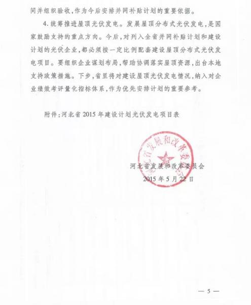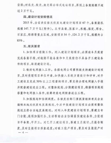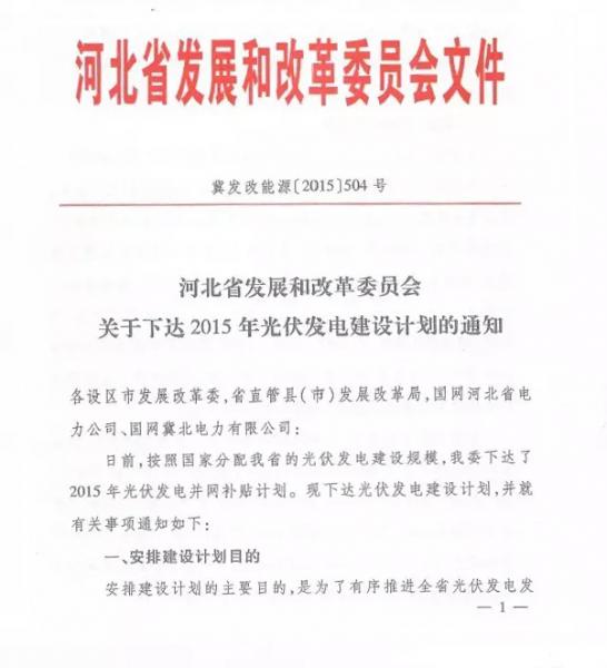 5月22日,河北省發(fā)展和改革委員會下發(fā)《關(guān)于下達(dá)2015年光伏發(fā)電建設(shè)計劃的通知》,翼發(fā)改能源【2015】504號文件。 通知指出,2015年河北光伏項目總體上堅持“三個原則”,既要鼓勵多上快干,又要把握適度有序。大力發(fā)展光伏發(fā)電,河北省有較好的產(chǎn)業(yè)基礎(chǔ)和資源條件