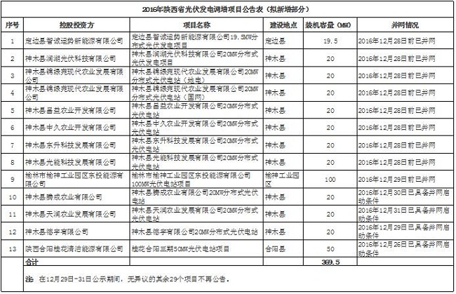 原標(biāo)題:關(guān)于陜西省2016年光伏發(fā)電項(xiàng)目競爭性比選結(jié)果的公告 來源:陜西省發(fā)展和改革委員會 關(guān)于陜西省2016年光伏發(fā)電項(xiàng)目競爭性比選結(jié)果的公告 2016年12月29日至31日,受省能源局委托,陜西省工程咨詢中心和中國電建集團(tuán)西北勘測設(shè)計研究院有限公司對陜西省2016年光伏發(fā)電項(xiàng)目競爭性比選結(jié)果和陜西省2016年光伏發(fā)電競爭性比選擬調(diào)增項(xiàng)目(合計33個項(xiàng)目)進(jìn)行了公示。 2017年1月3日,評審委員會會同省市縣相關(guān)部門對公示期間反饋的幾個項(xiàng)目問題進(jìn)行了核實(shí),并研究提出了擬新增上報調(diào)增項(xiàng)目方案。具體情況如下: 1.經(jīng)省電力公司、省地方電力公司核實(shí),靖邊協(xié)鑫光伏電力有限公司50MW光伏發(fā)電項(xiàng)目、定邊縣智信達(dá)新能源有限公司50MW光伏發(fā)電項(xiàng)目、神木縣遠(yuǎn)航新能源開發(fā)有限公司遠(yuǎn)航神木30MW光伏電站項(xiàng)目、神木縣太昌新型農(nóng)業(yè)風(fēng)光互補(bǔ)節(jié)能有限公司20MW光伏電站項(xiàng)目等4個項(xiàng)目,在2016年12月28日前已進(jìn)入并網(wǎng)程序,予以保留。其余29個項(xiàng)目在12月29日到12月31日公示期間,未提出異議,不再公告。 2.按照近日國家發(fā)改委《關(guān)于調(diào)增光伏發(fā)電陸上風(fēng)電標(biāo)桿上網(wǎng)電價的通知》(發(fā)改價格【2016】2729號)要求,經(jīng)評審組專家論證,建議適當(dāng)增加我省上報調(diào)增規(guī)模。定邊縣智誠運(yùn)勢新能源有限公司19.5MW分布式光伏發(fā)電項(xiàng)目、神木縣潤湖光伏科技有限公司20MW分布式光伏發(fā)電項(xiàng)目、神木縣錦綠苑現(xiàn)代農(nóng)業(yè)發(fā)展有限公司20MW分布式光伏電站(地電)、神木縣錦綠苑現(xiàn)代農(nóng)業(yè)發(fā)展有限公司20MW分布式光伏電站(國網(wǎng))、神木縣昌益農(nóng)業(yè)開發(fā)有限公司20MW分布式光伏電站、神木縣中久農(nóng)業(yè)開發(fā)有限公司20MW分布式光伏電站、神木縣東升科技發(fā)展有限公司20MW分布式光伏電站、神木縣光能科技發(fā)展有限公司20MW分布式光伏電站等8個項(xiàng)目在2016年12月28日前已實(shí)現(xiàn)并網(wǎng);榆林市榆神工業(yè)園區(qū)東投能源有限公司100MW光伏電站項(xiàng)目在2016年12月29日前已并網(wǎng);神木縣騰成農(nóng)業(yè)有限公司20MW分布式光伏電站、神木縣天潤農(nóng)業(yè)發(fā)展有限公司20MW分布式光伏電站、神木縣德宇有限公司20MW分布式光伏電站、桂花合陽三期50MW光伏電站項(xiàng)目等4個項(xiàng)目在2016年12月31日前均已具備并網(wǎng)啟動條件,合計13個項(xiàng)目增補(bǔ)到調(diào)增名單中。 3.對本次公告項(xiàng)目有異議的,由所在市(直管縣)發(fā)改部門統(tǒng)一匯總后報送省工程咨詢中心。 聯(lián)系人:俞衛(wèi)、黨江平 電 話:029—86234411 86269490 ![]() |
