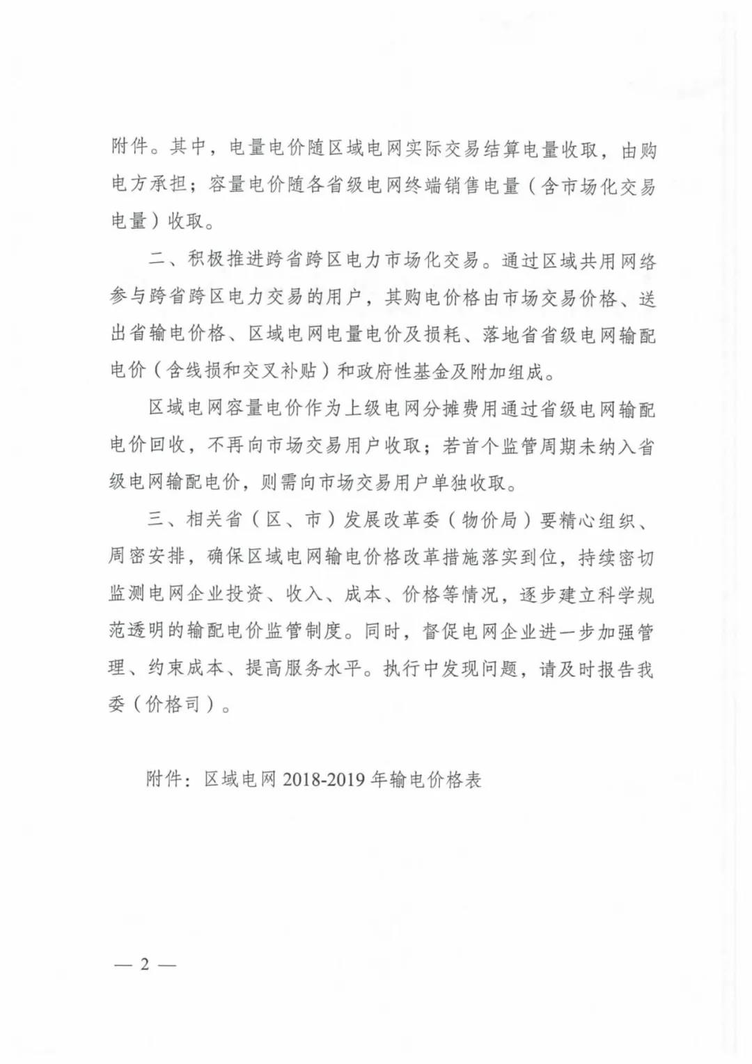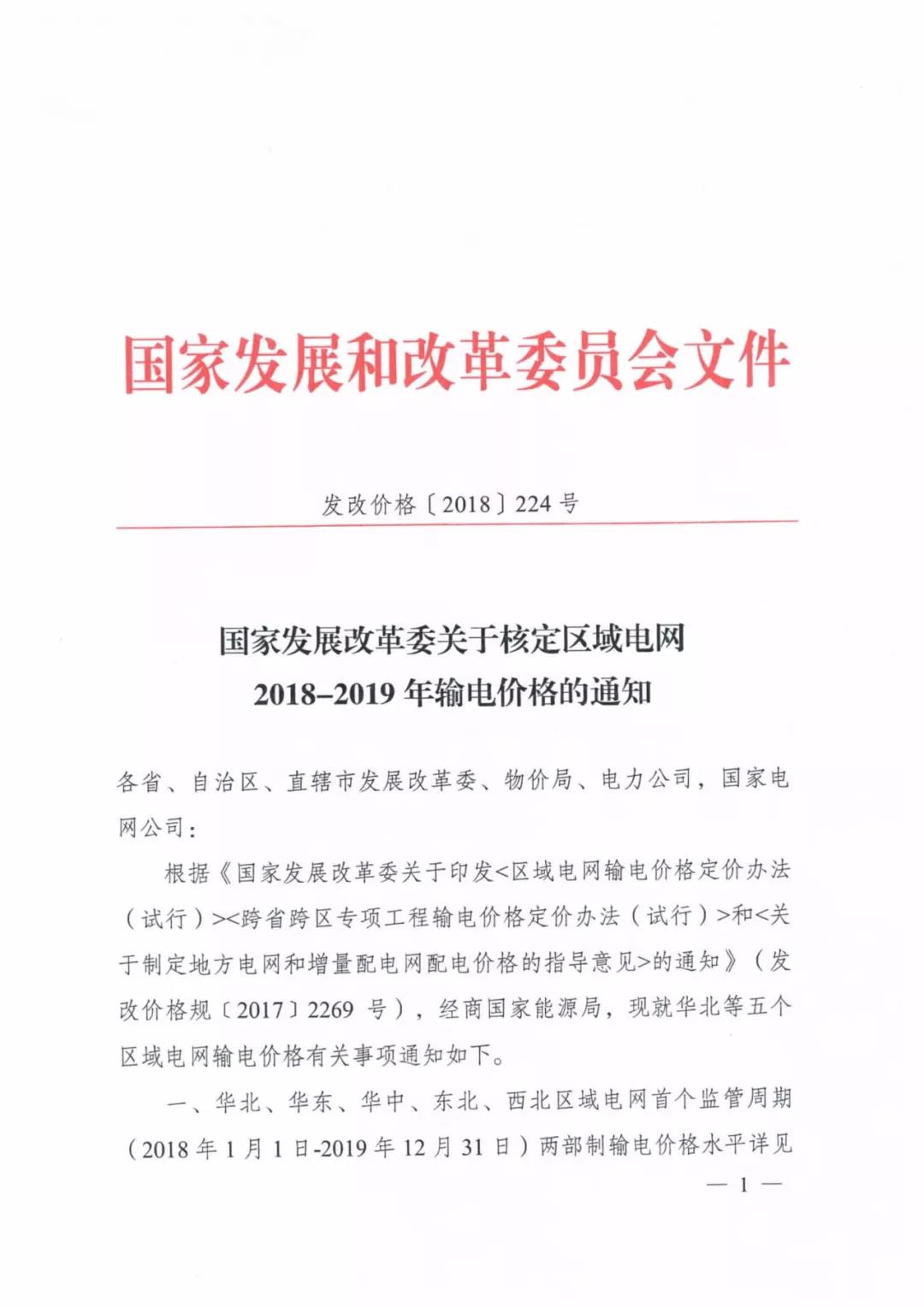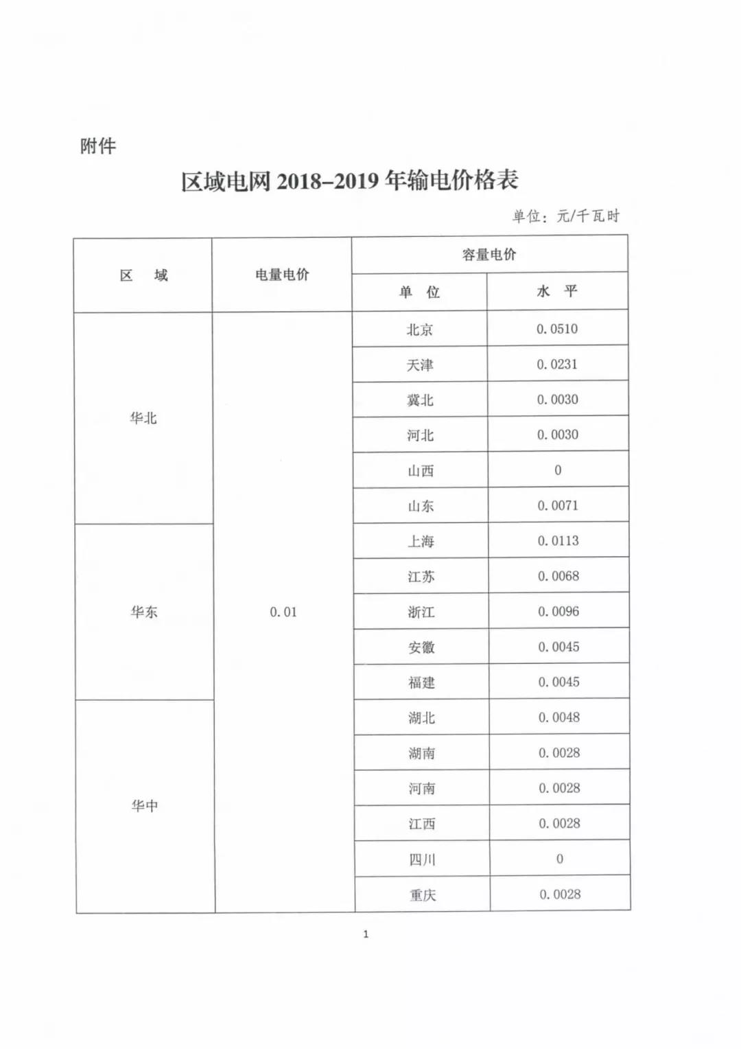 2018年2月,國家發(fā)展改革委印發(fā)《關(guān)于核定區(qū)域電網(wǎng)2018—2019年輸電價格的通知》(發(fā)改價格[2018]224號),規(guī)定了華北、華東、華中、東北、西北區(qū)域電網(wǎng)首個監(jiān)管周期(2018年1月1日—2019年12月31日)兩部制輸電價格水平,其中:電量電價隨區(qū)域電網(wǎng)實際交易結(jié)算電量