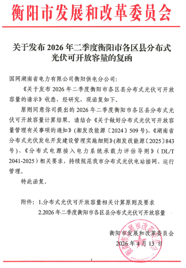 4月13日,湖南省衡陽(yáng)市發(fā)改委發(fā)布”關(guān)于發(fā)布2026年二季度衡陽(yáng)市各區(qū)縣分布式光伏可開(kāi)放容量的復(fù)函“,對(duì)全市2026年二季度分布式光伏可開(kāi)放容量進(jìn)行公示。