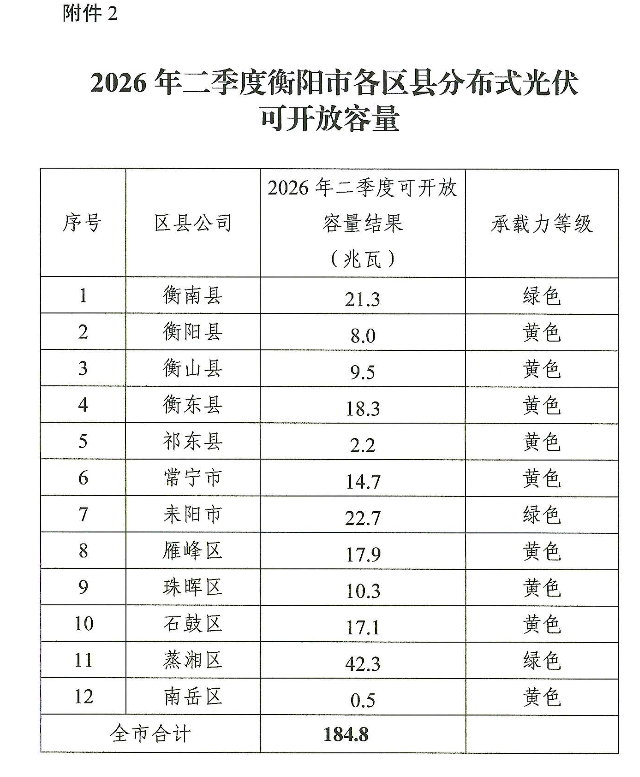 湖南衡陽(yáng)發(fā)布2026第二季度分布式光伏可開(kāi)放容量