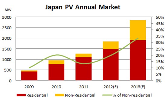 根據(jù)NPD Solarbuzz觀察,得益于2012年7月頒布的全國上網(wǎng)電價政策,日本光伏市場安裝量迅速增長,其中非住宅項目比例快速提高,預(yù)計到2013年將首次超過30%。我們預(yù)估2012年日本光伏安裝量將超過1.8GW,到了2015年達(dá)到5GW水平。