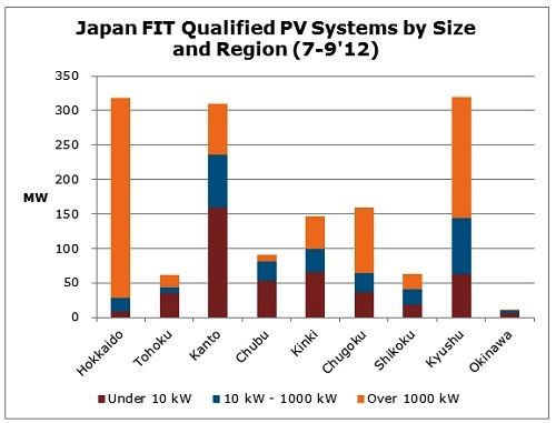 日本太陽能發(fā)電年度需求與住宅市場比例 (來源:NPD Solarbuzz) 在這1.5 GW的太陽能發(fā)電專案中,規(guī)模大于1 MW的專案比例超過了50%。具體到各個地區(qū)來看,九州地區(qū)獲得補貼資格的項目總?cè)萘孔疃。北海道地區(qū)獲批的大型地面專案超過其他區(qū)域,主要得益于大量可利用的空地資源。而在人口密度相對較高的關(guān)東地區(qū),核準(zhǔn)的專案以小型屋頂專案為主。